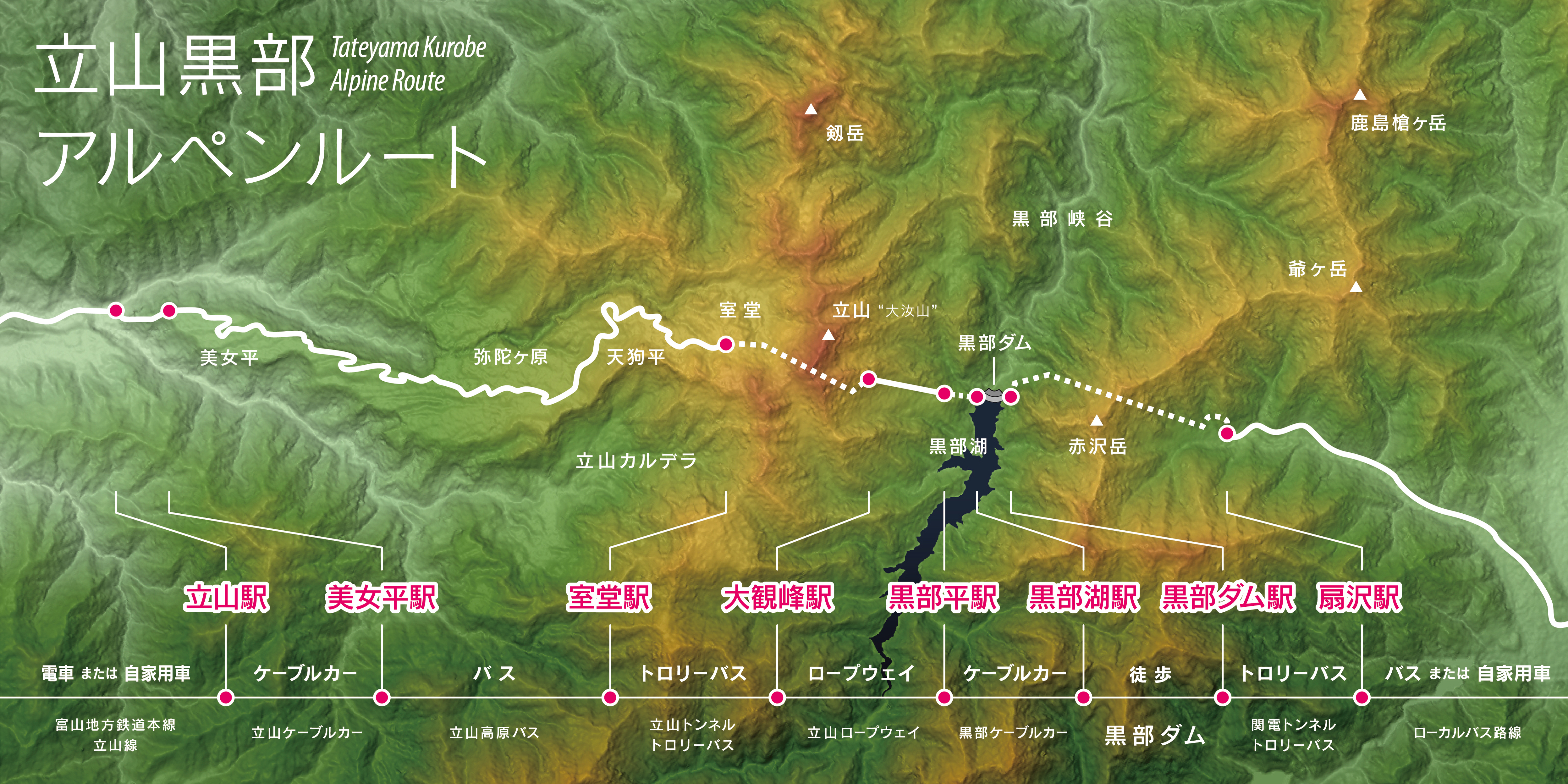 | 구로베 측 | 무로도 - 다테야마 터널 트롤리버스 - 다이칸보 다이칸보 - 다테야마 로프웨이 - 구로베다이라 구로베다이라 - 구로베 케이블카 - 구로베호 구로베호 - 구로베 유람선 - 구로베 댐 구로베 댐 - 간덴 터널 트롤리버스 - 오기사와역 |