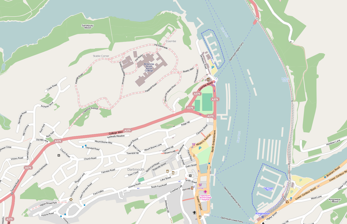 다트강 건너편의 킹스웨어와 세 개의 페리로 연결되어 있다. 하이어 페리와 로어 페리는 모두 차량을 수송하며, 여객 페리는 이름처럼 주로 킹스웨어 역에서 다트머스 증기 철도와 연결하기 위해 승객만 수송한다. 다트강을 가로지르는 가장 가까운 다리는 도로로 약 약 17.70km 떨어진 토트네스에 있다.[43]