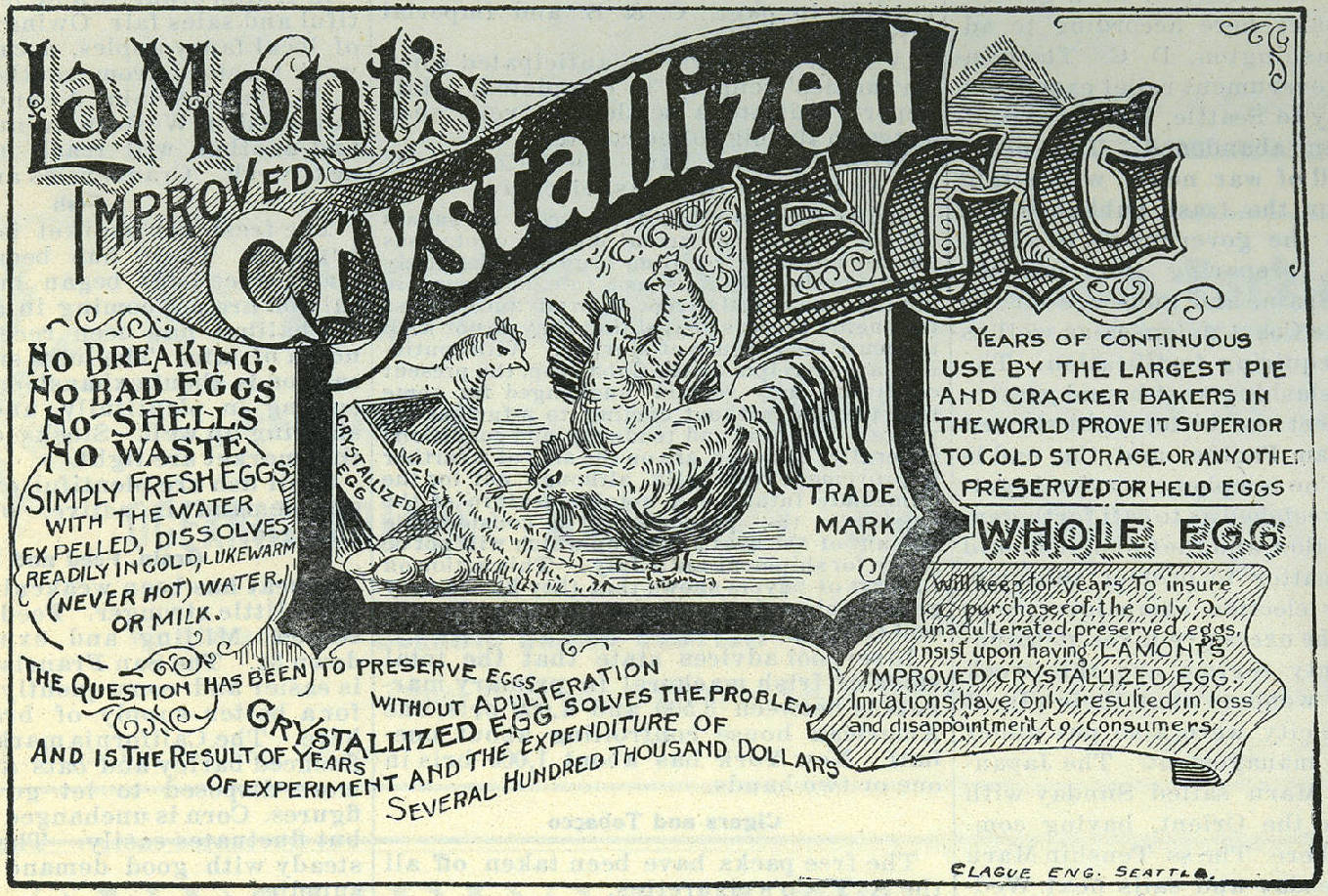 English: Based in St. Louis, Charles Fred LaMont's company produced egg substitutes and partly targeted miners of the Alaska Gold Rush. In 1898, the manufacturers shipped over 100,000 pounds of Crystallized Eggs to South African miners.