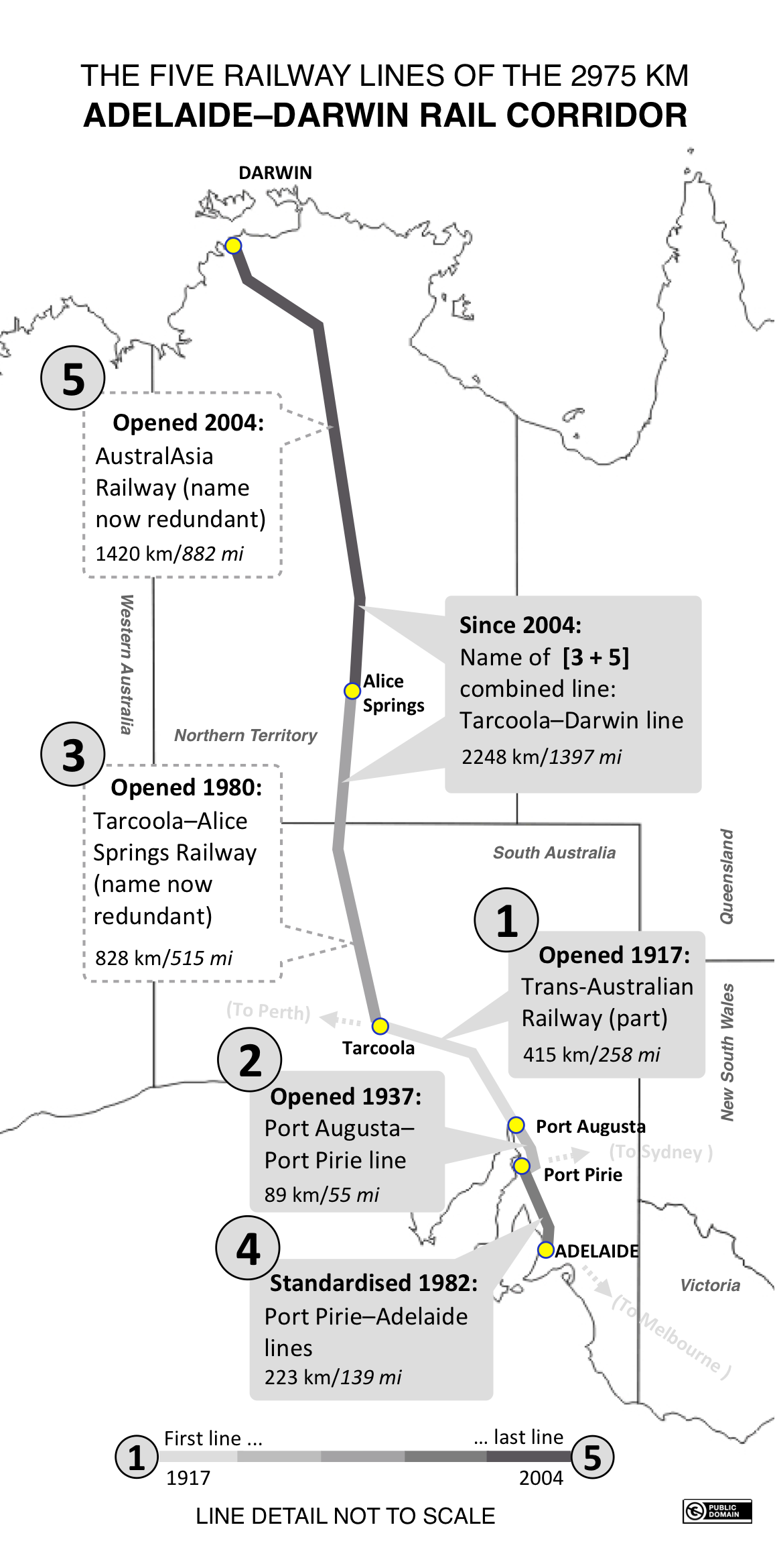 오스트레일리아의 남북횡단 철도 회랑은 20세기 동안 단계적으로 건설되었으며, 1980년에 828km 구간인 타르쿨라에서 앨리스 스프링스까지 완공된 후 1420km 구간이 남게 되었다.[4] 앨리스 스프링스에서 다윈까지의 마지막 구간은 2004년에 개통되었다. 애들레이드에서 다윈까지의 회랑 총 길이는 2975km이다. 회랑 완공으로 126년 동안 화물과 승객 모두 다른 궤간의 선로 사이에서 열차를 갈아타야 했던 상황이 종식되었다. 이 회랑은 현재 1435mm 표준궤로 통일되어 있으며, 화물 운송에 중요한 노선이다.