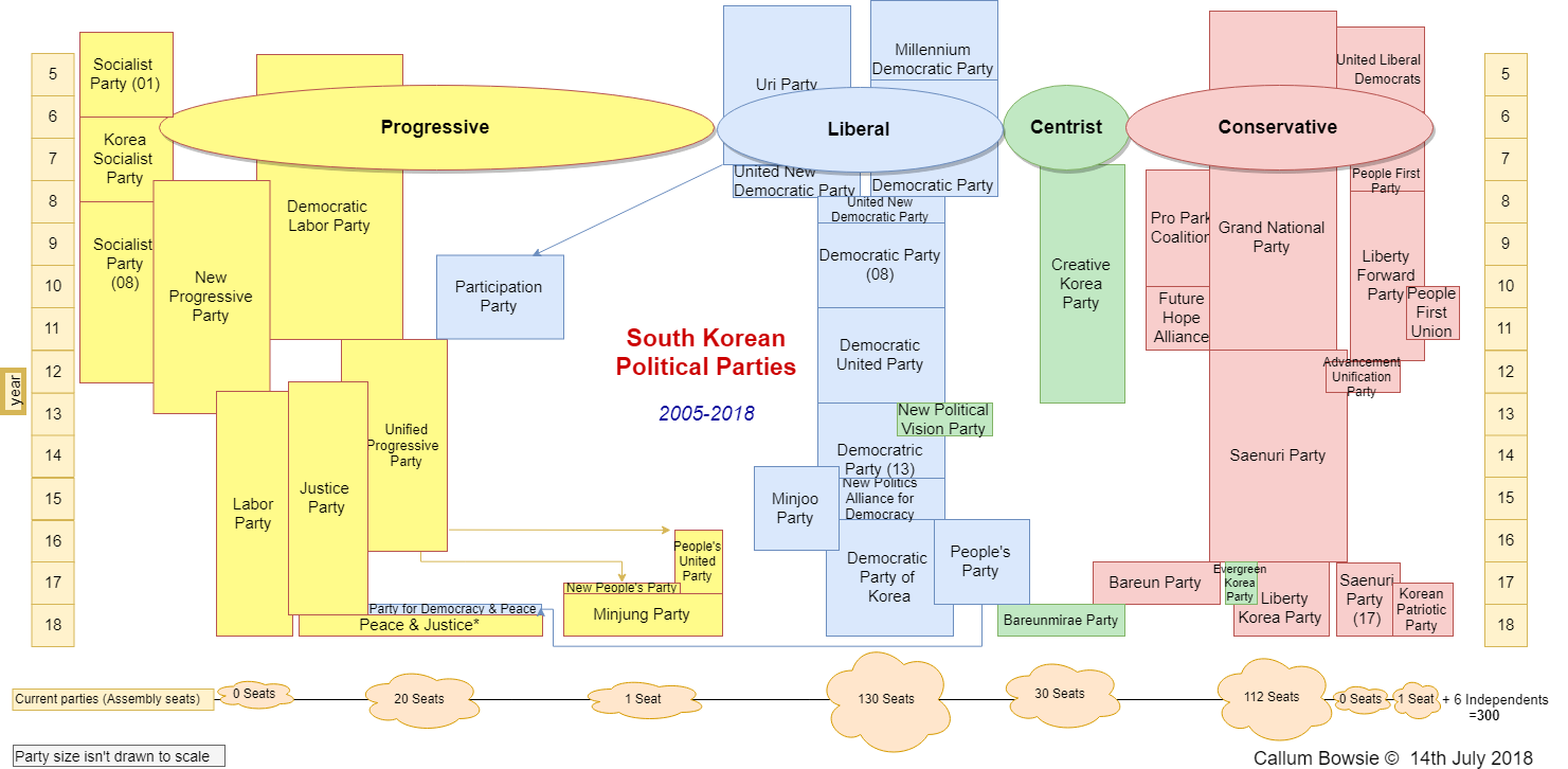 한국은 다당제를 채택하고 있으며, 몇몇 주요 정당이 협력하여 국회의 직무를 수행하고 있다. 2022년 현재, 보수·신자유주의 정당인 국민의힘 (여당)과 중도좌파의 더불어민주당 (야당)에 의한 양당제가 되고 있다.(그 외에도 좌파의 정의당 등, 몇 개의 의석을 가진 정당이 있다).