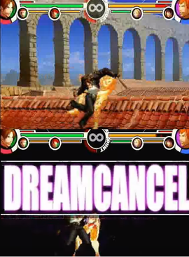 드림 캔슬 기능의 예시. 위 그림에서 쿠사나기 쿄는 텐도 가이를 상대로 초필살기를 사용하고 있지만, 더 강력한 기술을 사용하기 위해 아래쪽에서 드림 캔슬로 변경합니다.