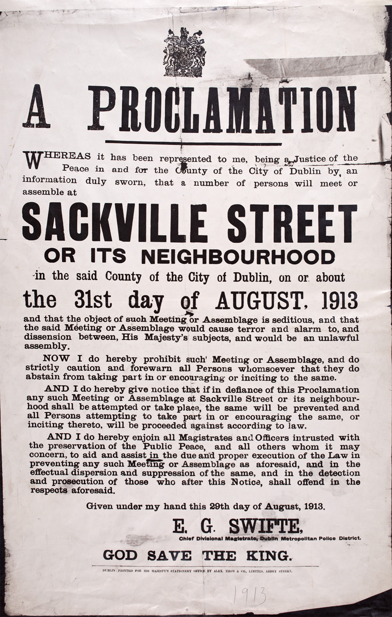 1913년 8월 31일, DMP는 당국에 의해 공개적으로 금지된 Sackville Street(현 오코넬 스트리트)에서 열린 집회를 공격했다. 이는 집회 금지에도 불구하고 노동조합 지도자 제임스 라킨이 노동자들을 위해 연설하려 나타난 것에 대한 대응이었다. 라킨은 토머스 맥도너프의 처제인 넬리 기퍼드의 도움으로 고용주 연합의 대표격인 윌리엄 마틴 머피 소유의 임페리얼 호텔로 몰래 들어가 발코니에서 연설을 시도했다. 경찰의 무력 진압 과정에서 제임스 놀란과 존 번이라는 두 명의 노동자가 사망했으며, 300명 이상이 부상을 입었다. 이 참혹한 사건은 "피의 일요일"로 불리게 되었으며, 이 용어는 이후 20세기 아일랜드에서 발생한 다른 유혈 사태나 리버풀 총파업 당시 경찰의 폭력적인 진압을 지칭하는 데도 사용되었다.[10]
