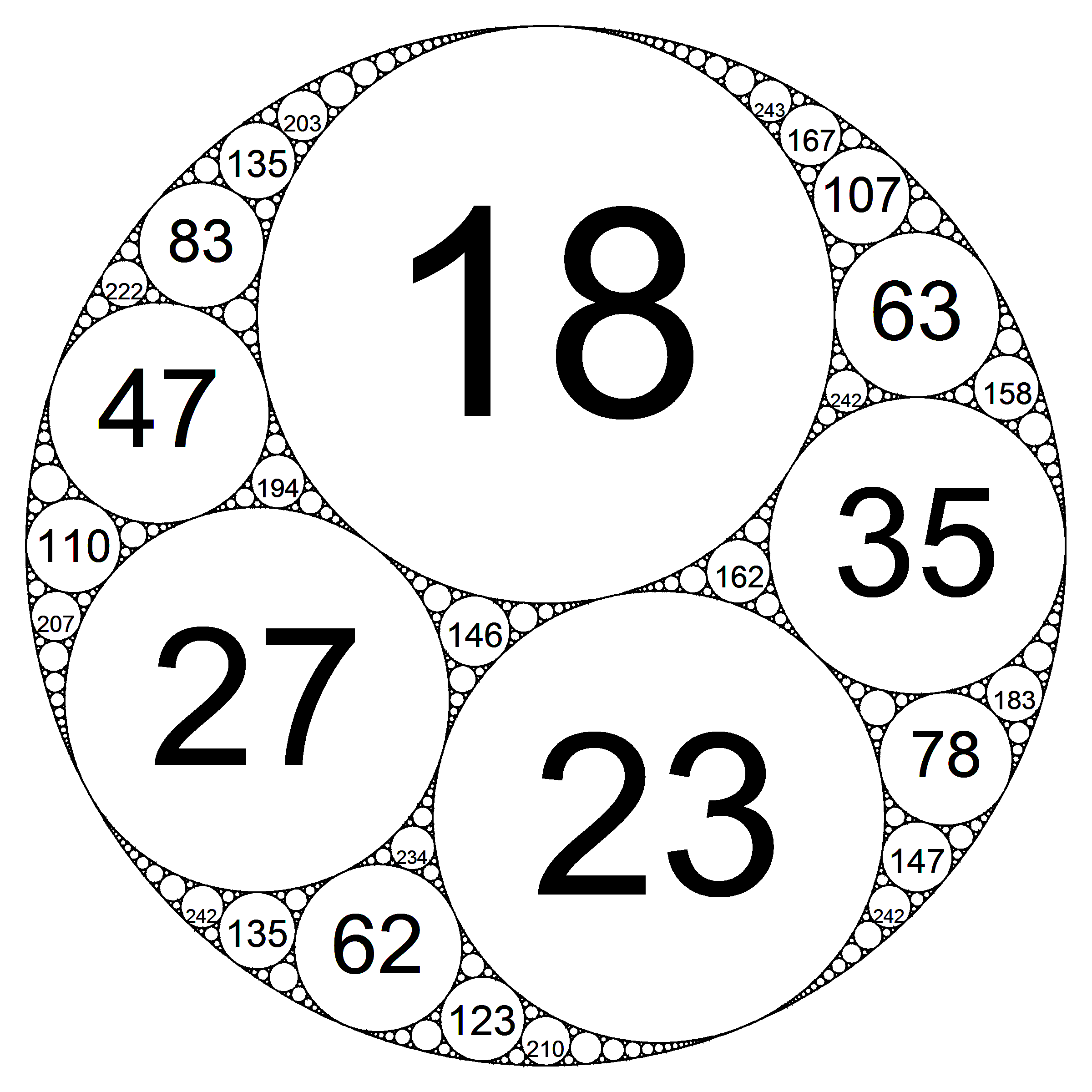 콕세터의 접하는 원들의 loxodromic 수열. 각 원은 수열에서의 위치를 나타내는 정수 ''i''로 표시되어 있으며, 반지름 ''ρ''''i''와 곡률 ''ρ''−''i''를 갖는다.