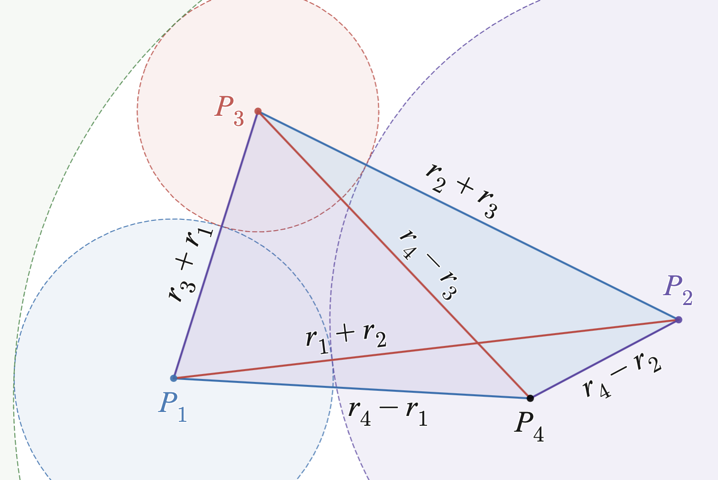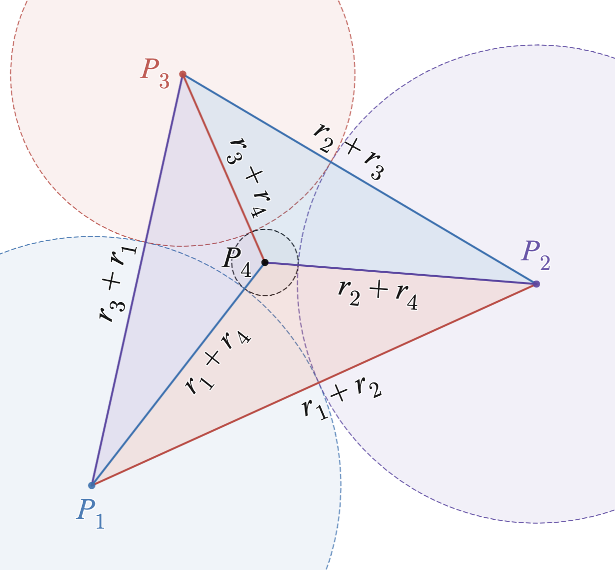 이제 \triangle P_1P_2P_3 내부에 중심 P_4가 있고 반지름이 r_4인 내접 소디 원을 고려한다. 삼각형 \triangle P_1P_2P_3는 세 개의 작은 삼각형 \triangle P_1P_2P_4, \triangle P_4P_2P_3, \triangle P_1P_4P_3으로 나눌 수 있다. 각 작은 삼각형의 넓이는 위 넓이 공식에서 한 반지름을 r_4로 바꾸어 얻을 수 있다. 따라서 \triangle P_1P_2P_3의 넓이는 이 세 작은 삼각형 넓이의 합과 같다.