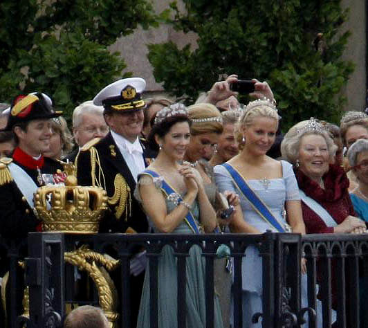 메리는 스웨덴의 빅토리아 왕세녀의 결혼식에 참석했다. 그녀는 (왼쪽부터) 프레데리크, 네덜란드 국왕 빌럼알렉산더르, 네덜란드의 막시마, 노르웨이의 메테마리트, 네덜란드의 베아트릭스와 함께 사진을 찍었다.