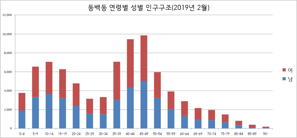 동백동의 인구는 2019년 2월 28일 기준으로 80,981명(내국인)이며, 용인시 전체 인구의 7.8%를 차지한다. 남자는 39,637명, 여자는 41,344명이다. 외국인은 남성 149명, 여성 211명으로 총 360명이다.