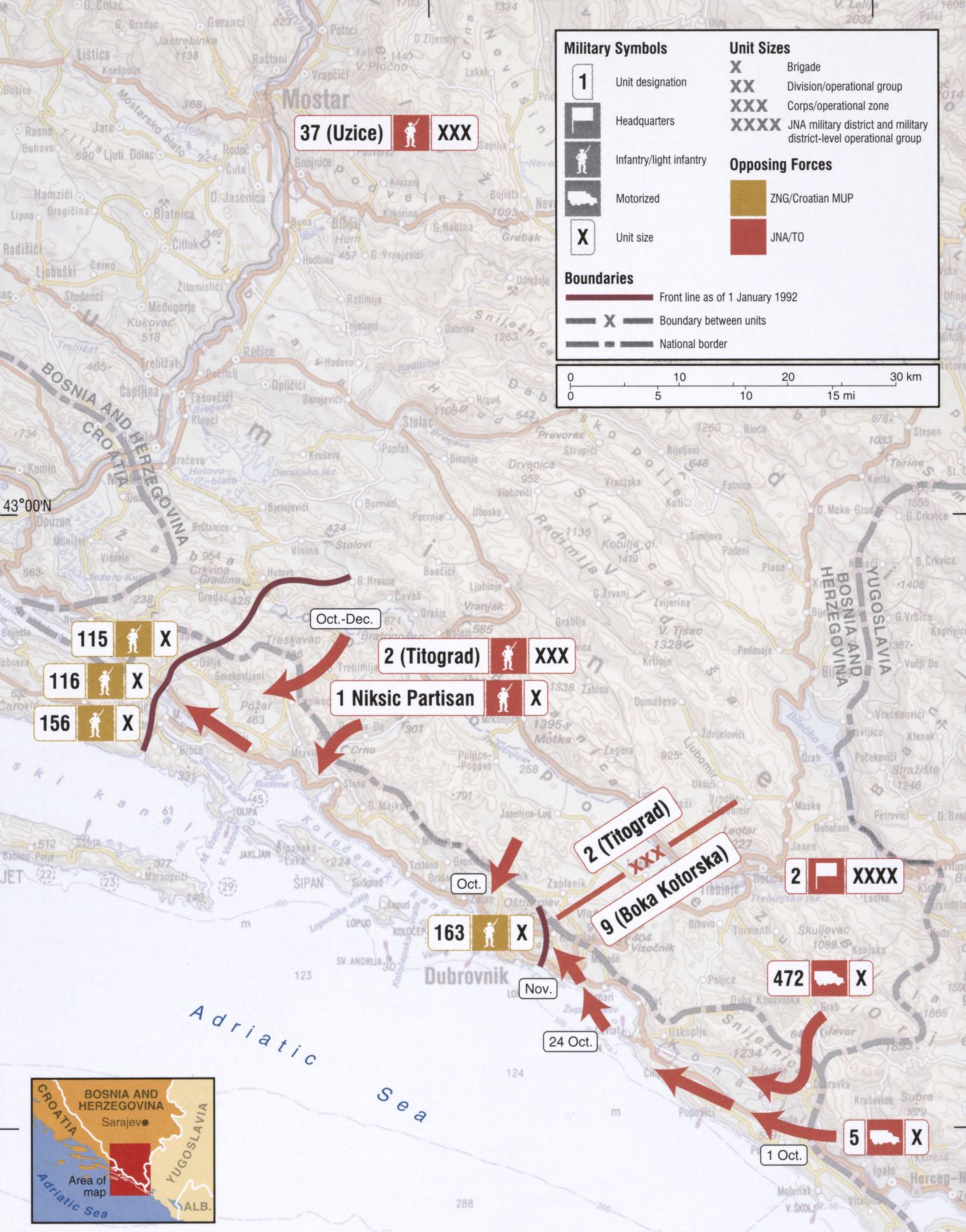 유고 인민군은 두브로브니크 지역을 차단하고 점령하기 위해 제2작전집단 예하 제2 티토그라드 군단과 제9 보카코토르스카 해양부문군구를 투입했다. 제2 티토그라드 군단은 제1니키치여단을, 제9 보카코토르스카 해양부문군구는 제5, 제472차량화여단을 배치했으며, 작전경계선은 두브로브니크 인근을 남북으로 지나는 선이었다.[28] 이 외에도 제16국경순찰대, 제107해안포병집단, 헤르체그노비, 코토르 등지의 영토방위군 부대도 동원했다.