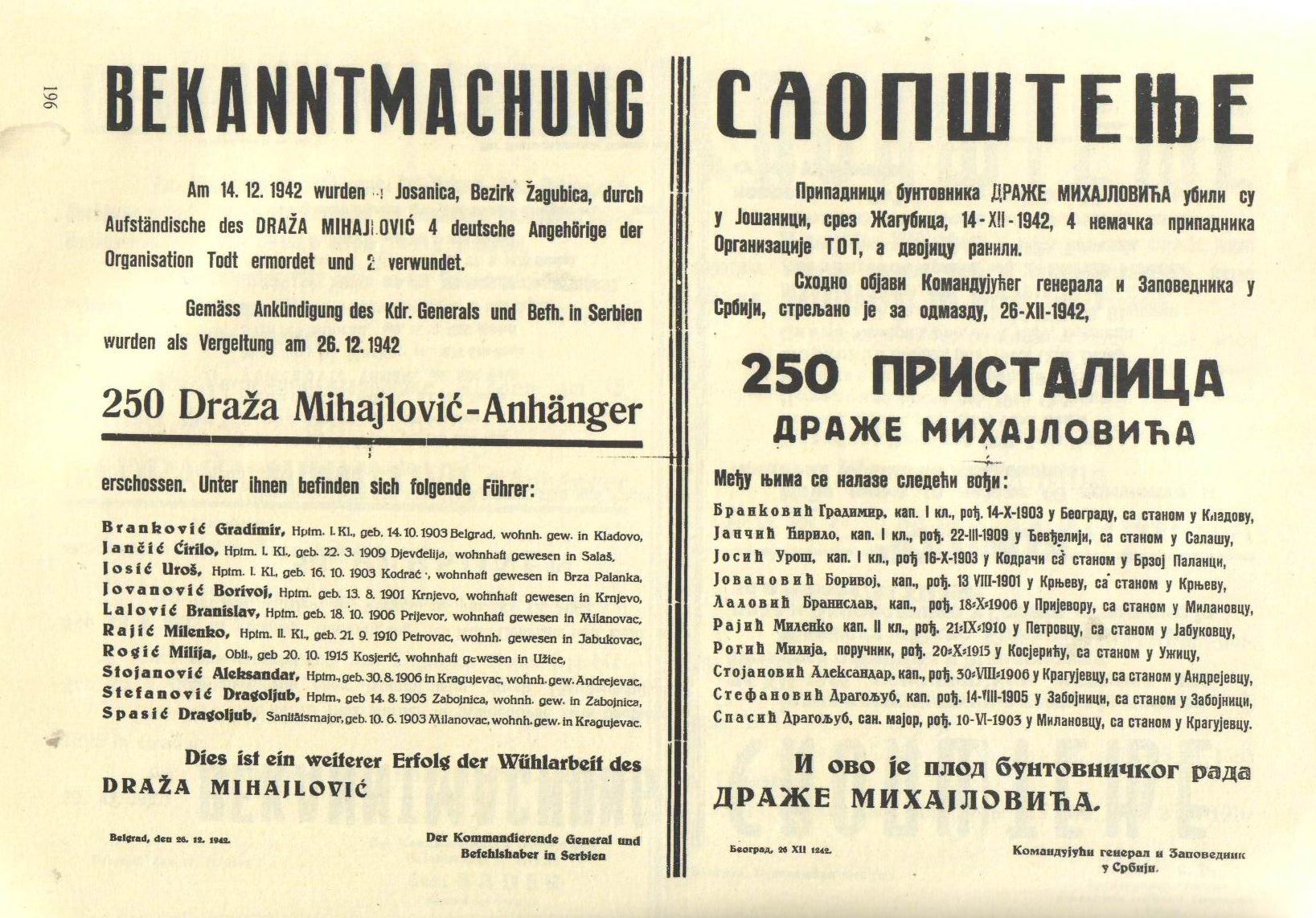 11월 13일, 미하일로비치의 체트니크는 독일군에게 365명의 파르티잔 포로를 넘겨주었다. 베르마흐트는 나중에 이들 중 최소 261명을 처형했다.