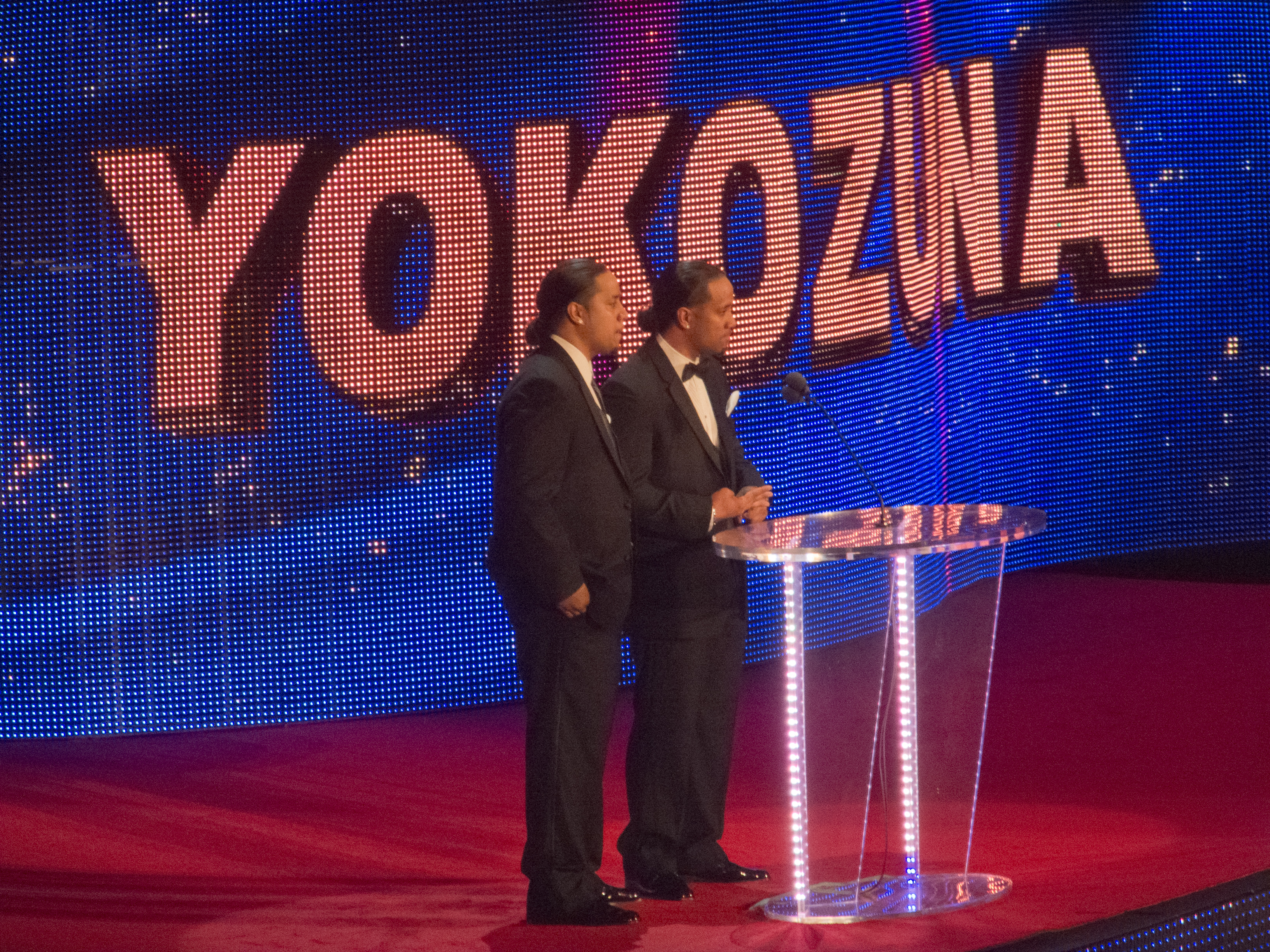 2012년 WWE 명예의 전당 시상식에서 사촌 요코주나를 헌액하는 디 우소스