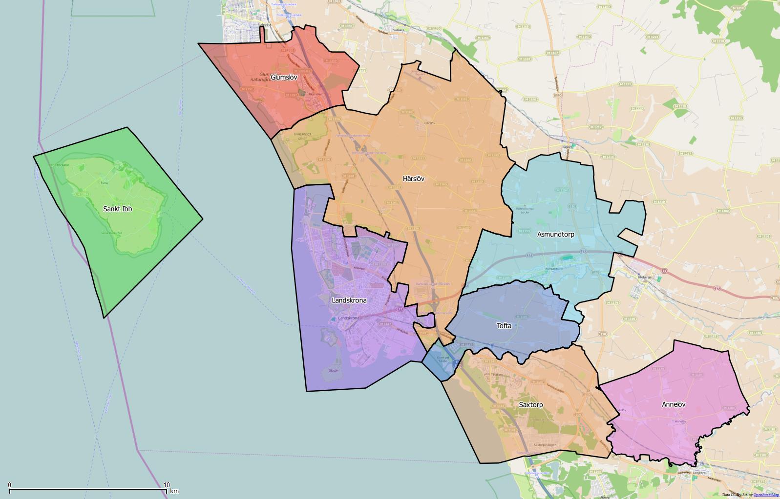 란스크로나 시는 2016년부터 8개의 행정 구역으로 나뉜다. 이 구역들은 안넬뢰브, 아스문토르프, 글룸슬뢰브, 헤르슬뢰브, 란스크로나, 상트 이브(Ven), 삭스토르프, 그리고 토프타이다.[1]3. 인구 통계