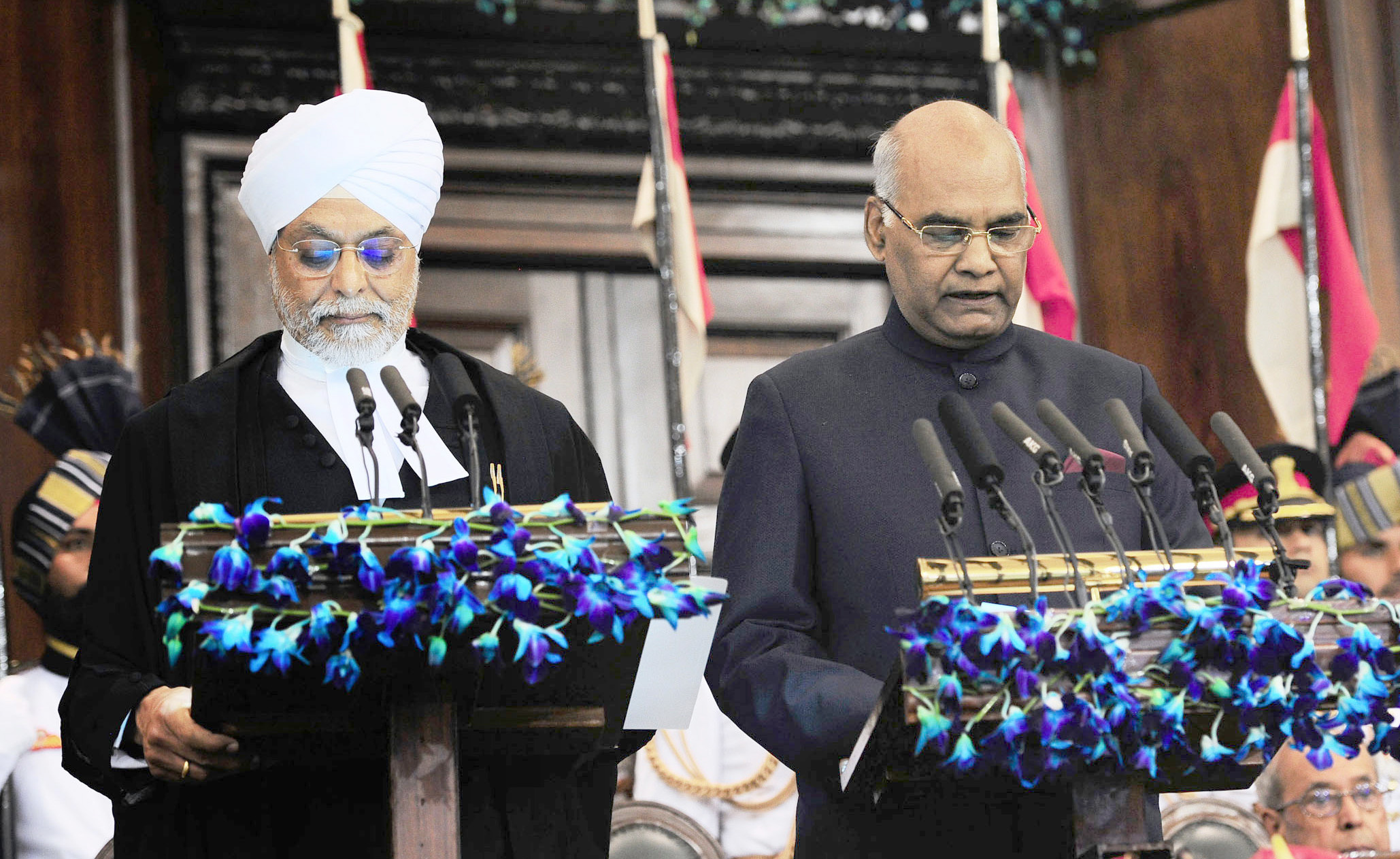 J. S. 케하르 인도 대법원장이 2017년 뉴델리의 국회의사당 중앙 홀에서 열린 취임식에서 람 나트 코빈드에게 인도 대통령 선서를 집행하고 있다.