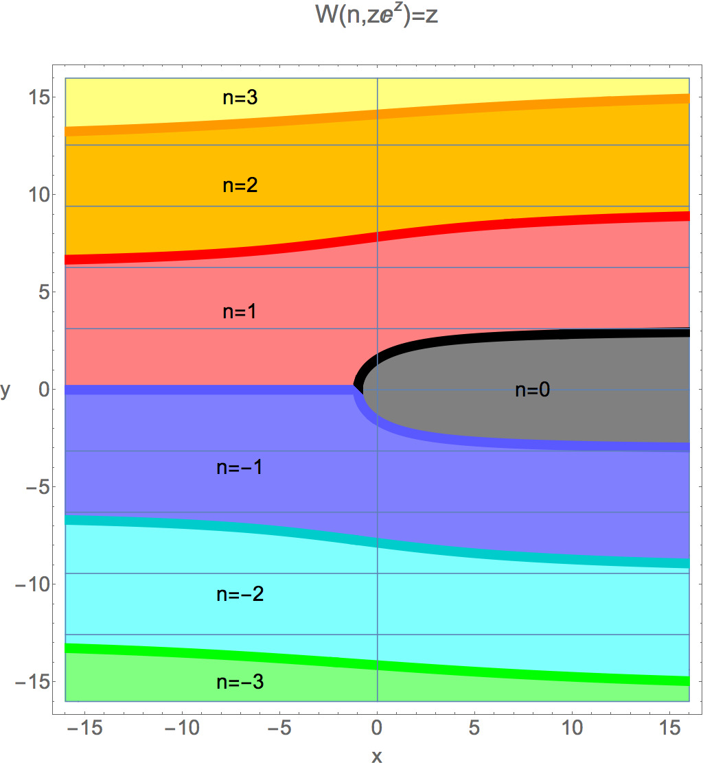 람베르트 W 함수는 무수히 많은 가지를 가지며, 정수 ''k''에 대해 ''Wk''(''z'')로 표시됩니다. ''W''0(''z'')는 주 가지(또는 주요 가지)입니다.