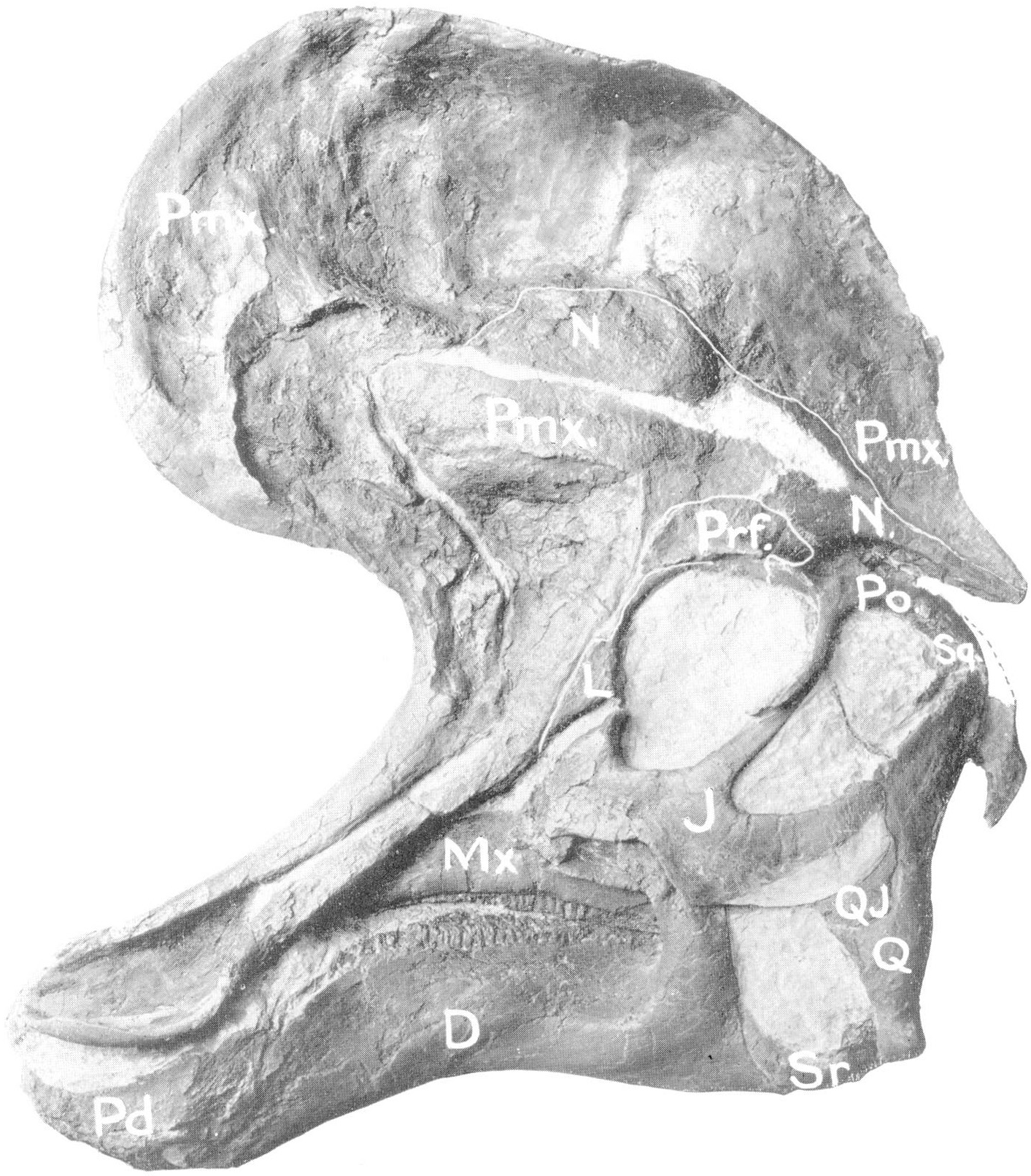 ''람베오사우루스''(Lambeosaurus)는 복잡한 분류학적 역사를 가지고 있다. 1902년 로렌스 람베(Lawrence Lambe)는 앨버타에서 발견된 하드로사우루스과 화석(원래 캐나다 지질 조사국(GSC) 419)에 ''트라코돈(Trachodon) marginatus''라는 이름을 붙였다.[2] 같은 출판물에서 람베는 공룡 공원 지층(Dinosaur Park Formation)에서 발견된 왼쪽 위턱(GSC 1092)을 ''트라코돈 알티덴스''(Trachodon altidens)로 기술했다.[3] 헨리 페어필드 오스본(Henry Fairfield Osborn)은 ''T. 알티덴스''(T. altidens)가 "디다노돈"(Didanodon)이라는 새로운 속에 속할 수 있다고 제안했다.[2]