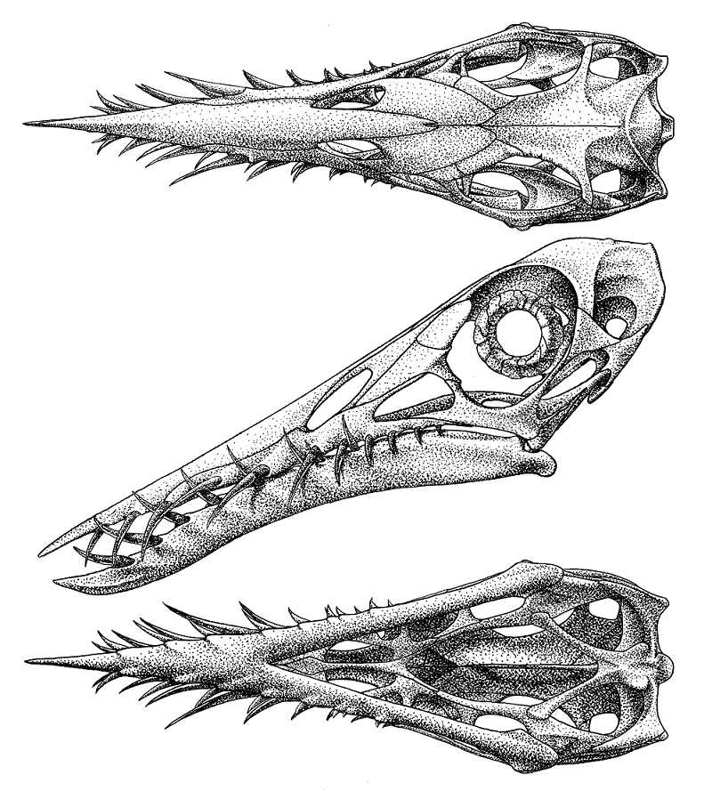 1927년 익룡 연구자 페르디난트 브로일리는 ''람포링쿠스'' 표본에서 두개골 길이 대부분을 따라 이어진 2mm 높이의 얇은 뼈로 된 볏을 발견했다고 주장했다.[14] 그러나 1975년 페터 벨른호퍼와 2002년 크리스토퍼 베넷이 가시광선과 자외선을 사용하여 이 표본을 조사한 결과 볏의 흔적을 발견하지 못했으며, 브로일리의 주장이 잘못되었다고 결론 내렸다.[15][16] 그들은 가상의 볏이 단순히 보존의 산물이라고 결론 내렸다.[15][16] ''람포링쿠스''의 이빨은 턱을 닫았을 때 서로 맞물리며, 어식성 식단을 시사한다.[2] 위턱에는 20개, 아래턱에는 14개의 이빨이 있다.[2]3. 2. 꼬리