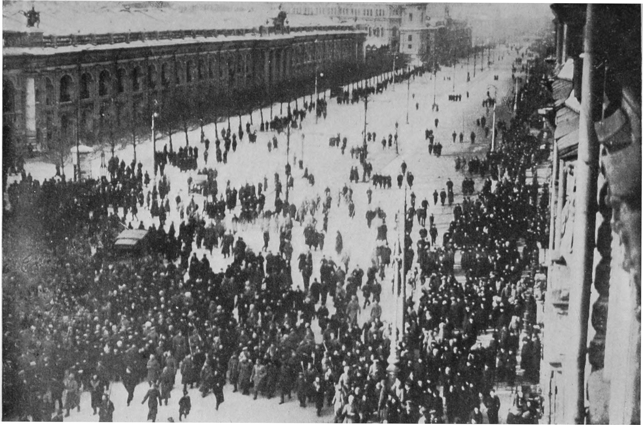 1917년 2월 23일(율리우스력, 3월 8일) 국제 여성의 날을 맞아 러시아 수도 페트로그라드(지금의 상트페테르부르크)에서 여성 노동자들이 식량 배급 개선을 요구하며 시위를 벌였다.[24] 이 시위는 곧 노동자, 군인, 시민들이 합세하면서 대규모 봉기로 발전했다.