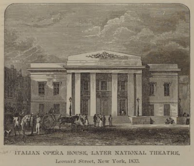 1833년, 84세의 나이에 미국 최초의 오페라 극장인 뉴욕 시의 이탈리아 오페라 하우스를 레너드와 처치 스트리트 북서쪽 코너에 설립했는데, 이는 당시 도시에서 볼 수 있던 어떤 극장보다 훨씬 뛰어났다.[19][20][22][21] 그러나 사업 수완 부족으로 극장은 두 시즌 만에 해산되고 극장은 회사의 부채를 갚기 위해 매각되었다. 1836년 오페라 하우스는 내셔널 극장이 되었다. 1839년 이 건물은 화재로 전소되었지만, 신속하게 재건되어 다시 문을 열었다. 그러나 1841년 5월 29일, 다시 화재로 파괴되었다.[22] 다 폰테의 오페라 하우스는 뉴욕 음악 아카데미와 뉴욕 메트로폴리탄 오페라의 전신이었다.