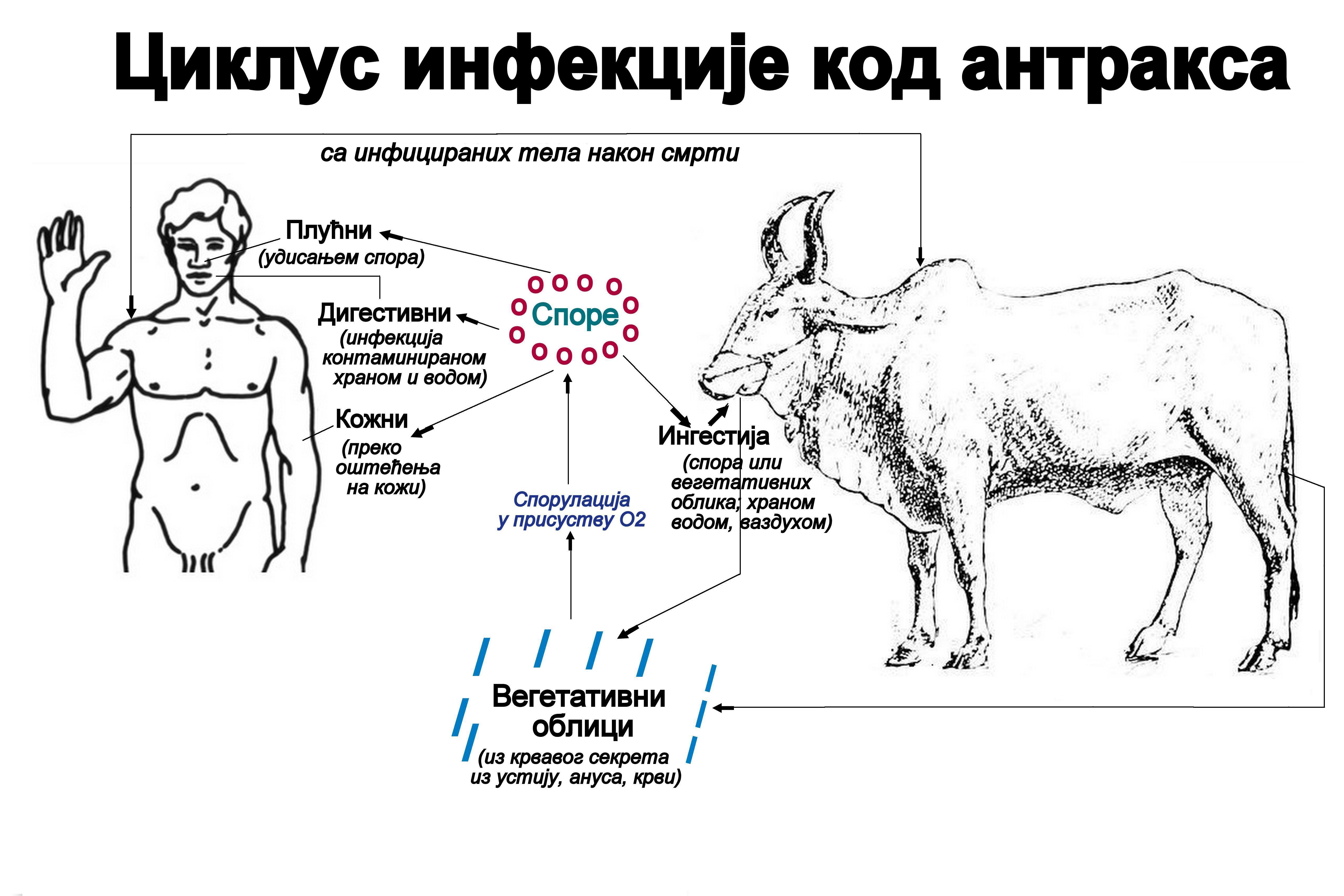 로베르트 코흐는 탄저병 연구로 널리 알려져 있으며, 이 치명적인 질병의 원인균이 탄저균(Bacillus anthracis)임을 밝혀냈다.[19] 1872년 폴란드 볼슈타인(Wolsztyn, 당시에는 Wollstein)의 구역 의사가 된 후, 코흐는 탄저병 연구에 몰두하기 시작했다. 볼슈타인 근처에서는 사람과 가축이 탄저병으로 정기적으로 목숨을 잃었지만, 그 원인은 밝혀지지 않았다. 1876년, 코흐는 탄저병이 단일 병원체에 의해 유발된다는 것을 발견하였다. 코흐는 휴면 상태인 탄저균 포자를 발견함으로써 탄저병의 미스터리를 풀 수 있었다. 이 병원체에 대한 이해를 높임으로써, 그는 세균의 주목할 만한 환경 저항성을 밝힐 수 있었다.[19]그는 1876년 뵐슈타인(Wöllstein)에서 근무하는 동안 "''Die Ätiologie der Milzbrand-Krankheit, Begründet auf die Entwicklungsgeschichte des Bacillus Anthracis''"(''탄저병의 병인론, 탄저균의 발달 과정에 근거하여'')라는 소책자에 이 발견을 발표했다.[20] 1877년 탄저균 구조에 관한 그의 논문[21]은 세균의 최초 사진 촬영을 기록했다.[13] 그는 특정 조건 하에서 휴면 상태를 유지할 수 있는 탄저균의 포자 형성을 발견했다.[15] 그러나 최적의 조건 하에서는 포자가 활성화되어 질병을 일으켰다.[15] 이 원인균을 규명하기 위해 그는 세균 배양액을 유리 슬라이드에 건조 고정하고, 염색약을 사용하여 배양액을 염색하고, 현미경으로 관찰했다.[22] 그의 탄저병 연구는 특정 미생물을 특정 질병과 연관시킨 최초의 연구라는 점에서 주목할 만하며, 자연 발생설을 반박하고 세균설을 뒷받침했다.[19]