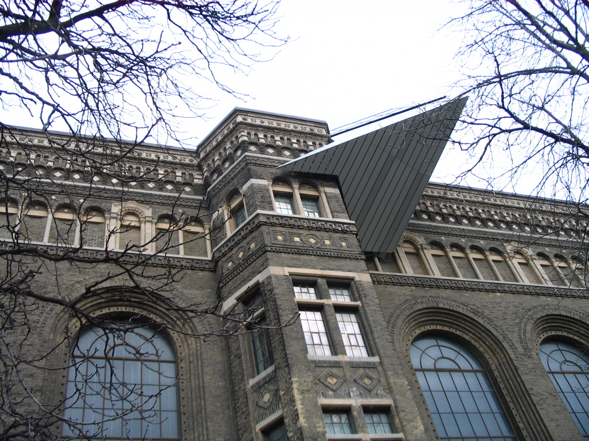 토론토 대학교의 철학자의 산책로를 따라 부지 서쪽 가장자리에 건설된 원래 건물은 토론토 건축가 프랭크 달링과 존 A. 피어슨이 설계했으며,[30] 이탈리아식과 신로마네스크 양식이 융합된 건축 양식이다. 건물은 무겁게 쌓여 있으며 둥글고 분절된 아치형 창문과 두꺼운 테두리 및 후드 몰딩으로 강조되어 있다. 다른 특징으로는 장식적인 처마 받침, 귀석, 코니스가 있다.