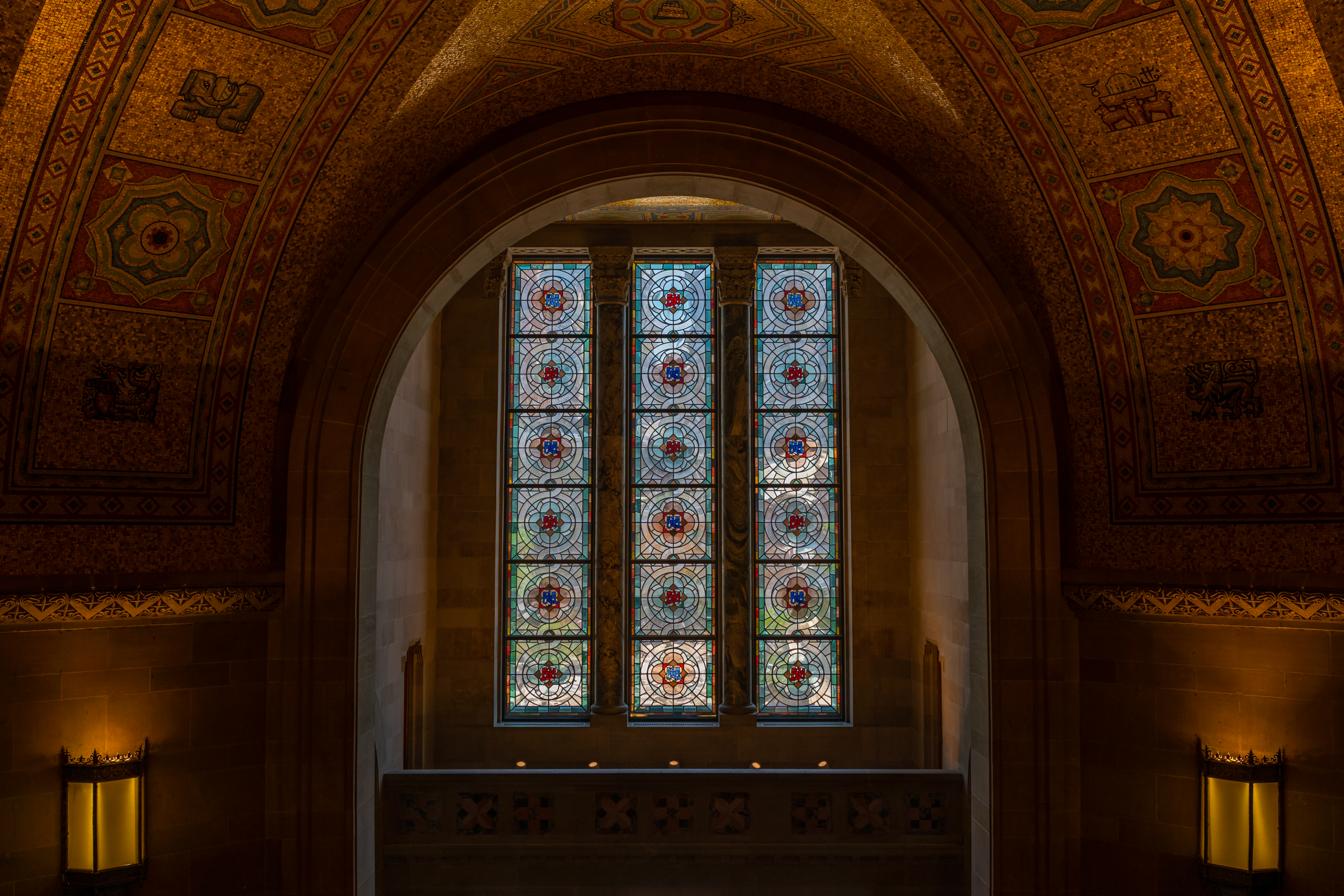 > 건물 내부는 놀랍고 즐거운 곳입니다. 외관의 다소 복잡한 장식은 잊혀지고 대규모 계획이 펼쳐집니다. 간단하고 직접적이며 규모가 큽니다. 디자이너의 초기 보자르 훈련이 헛되지 않았다는 것을 확신하게 됩니다. 내부의 가장 두드러진 특징은 입구 로툰다의 유리 모자이크 천장입니다. 색상과 금색으로 제작되었으며, 건축가가 전시물과 충돌하지 않고 장식할 수 있는 건물의 한 부분에서 훌륭한 분위기를 자아냅니다.