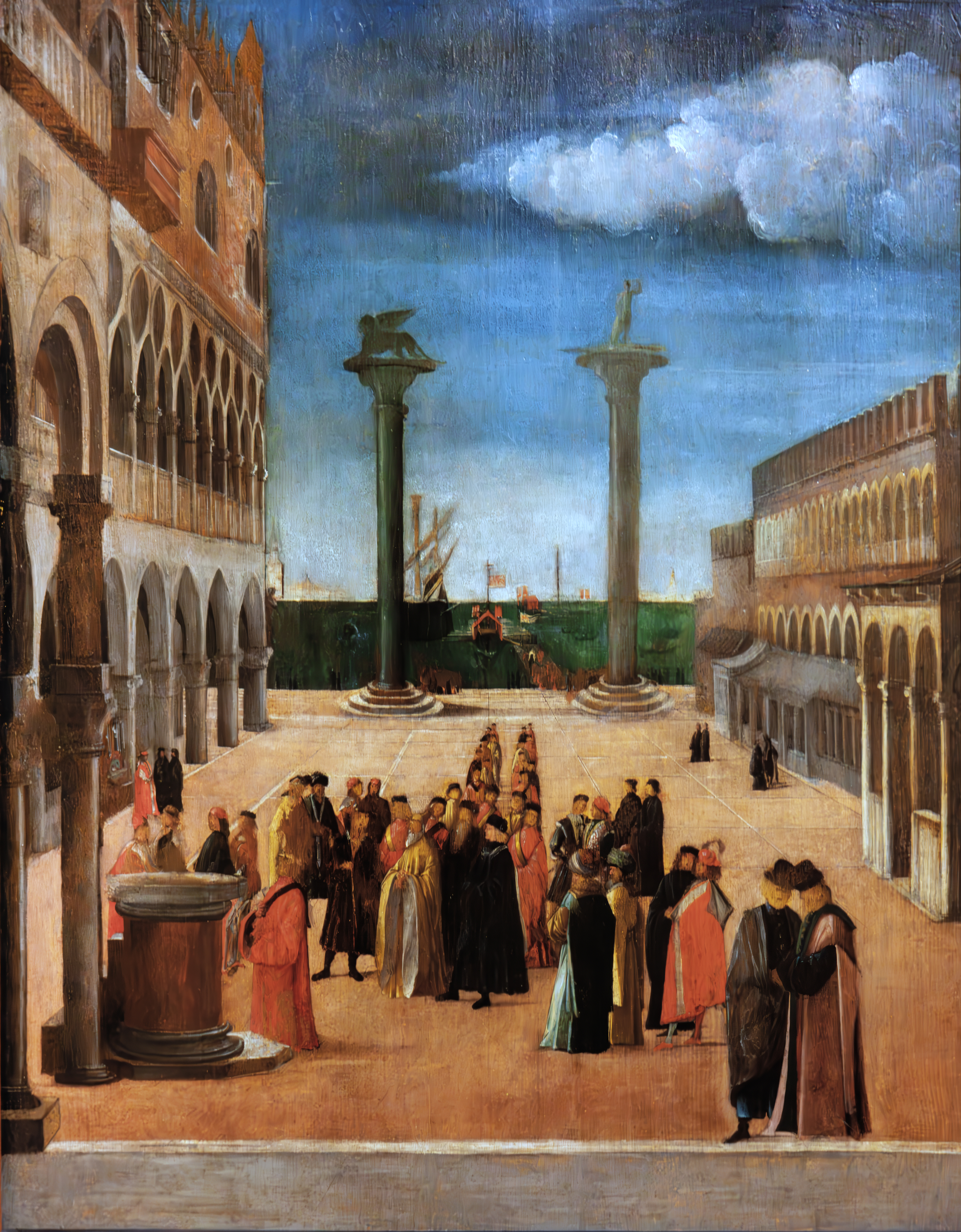 로지아라고 불리는 지붕이 있는 외부 갤러리는 공공 집회 장소로 사용되었으며, 일반적으로 리알토 산 자코모 성당, 산 니콜로 데이 멘디콜리 성당과 같은 베네치아의 교회 정면에 지어졌다. 리알토의 카멜렌기 궁전 건물에도 귀족들이 도시의 상업 중심지에서 사업 문제를 논의할 수 있는 회의 장소로 비슷한 구조가 부착되었다.[3]13세기 말부터 17세기 후반까지, 로지아는 정부 업무로 광장에 오는 귀족들의 집회 장소로 산 마르코 광장에도 존재했다. 산 바소 성당에 부착되었지만, 특히 광장 주변의 공공 건물에 대한 책임을 지는 산 마르코 '데 수프라'의 조달관의 관할 하에 있었다.