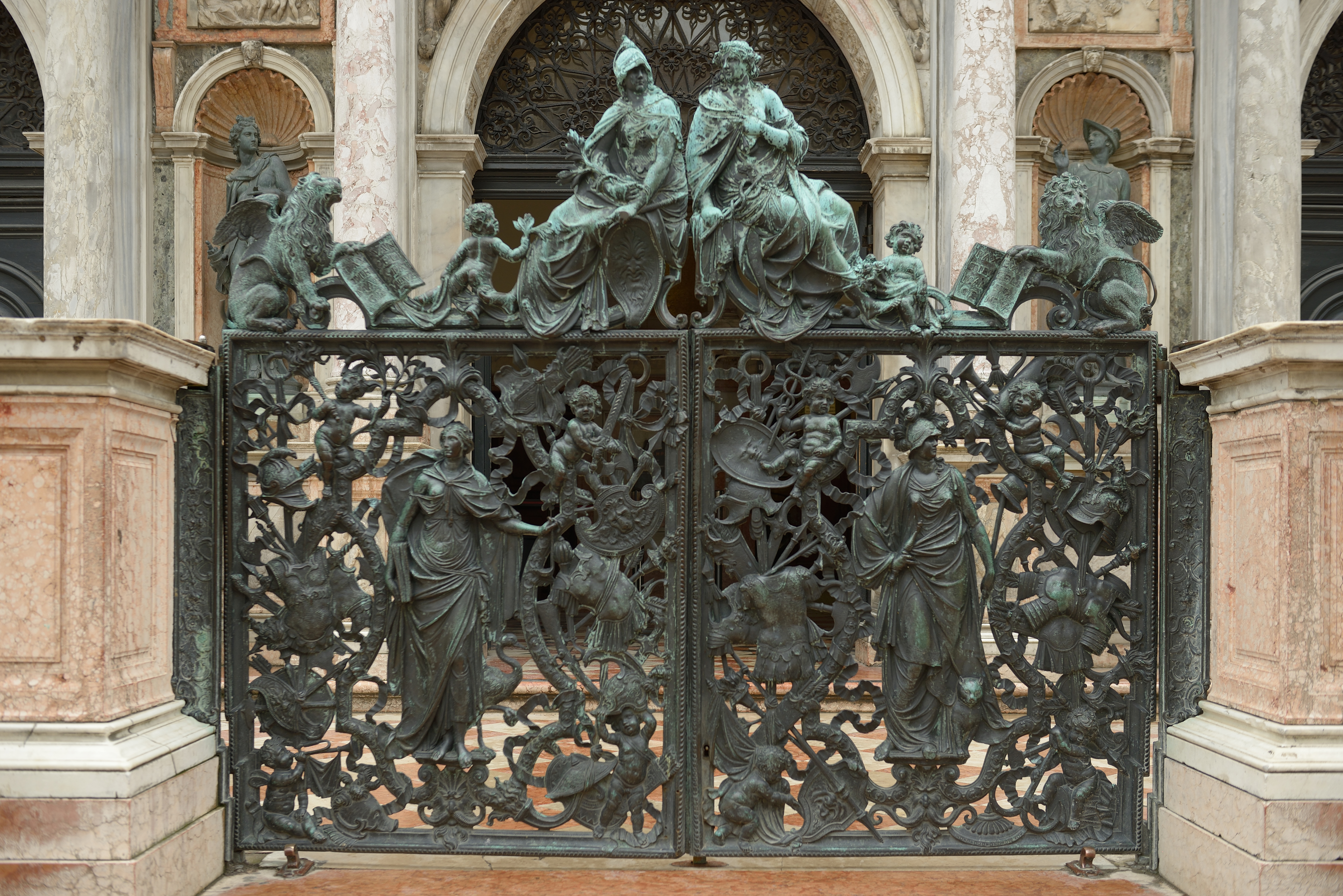 안토니오 가이는 1733년부터 1734년까지 경계(왼쪽, 불이 켜진 램프와 발로 조약돌을 잡고 있는 학)와 자유(오른쪽, 지팡이에 필레우스가 있음)를 의인화한 형상을 표현한 청동 문을 정교하게 조각했다.[22] 문 위에는 무장한 평화(왼쪽, 헬멧과 올리브 가지)와 공공의 행복(오른쪽, 카두케우스와 풍요의 뿔)이 조각되어 있다.