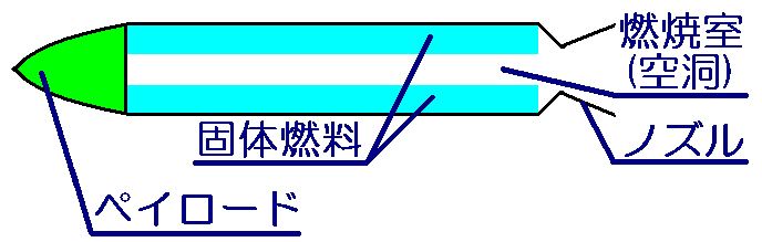 고체 연료 로켓은 고체 상태의 연료와 산화제를 미리 혼합하여 로켓 본체에 채워 넣은 고체 추진제를 사용하는 로켓이다.[17] 액체 연료 로켓과 달리 연료를 연소실로 이송하기 위한 펌프 등의 복잡한 기계 장치가 필요 없어 구조가 비교적 간단하다. 일반적으로 로켓 케이스, 노즐, 고체 추진제, 점화 장치 등으로 구성된다.[17][18]고체 추진제는 크게 컴포지트 추진제와 균질 혼합물 기반 추진제로 나눌 수 있다. 컴포지트 추진제는 과염소산 암모늄(AP)과 같은 고체 산화제 입자와 알루미늄(Al) 분말과 같은 금속 연료를 폴리부타디엔(HTPB) 계열의 고분자 결합제와 혼합하여 만든다.[19] 균질 혼합물 기반 추진제(단일, 이중, 삼중 기반 등)는 니트로셀룰로스나 니트로글리세린처럼 연료와 산화제 역할을 동시에 하는 성분을 포함하며, 거시적으로는 균일한 형태로 만들어진다.