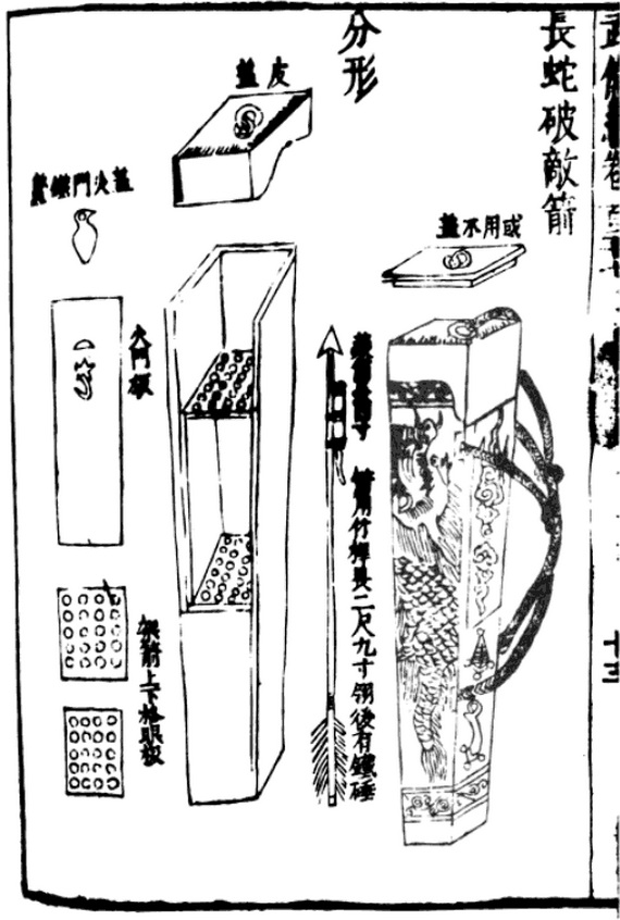 무비지(17세기)에 묘사된 "장사(長蛇) 적 파괴" 화전 발사기. 32개의 중형 소형 독 로켓을 탑재하고 있으며, 등에 짊어질 수 있는 끈이 달려 있다.