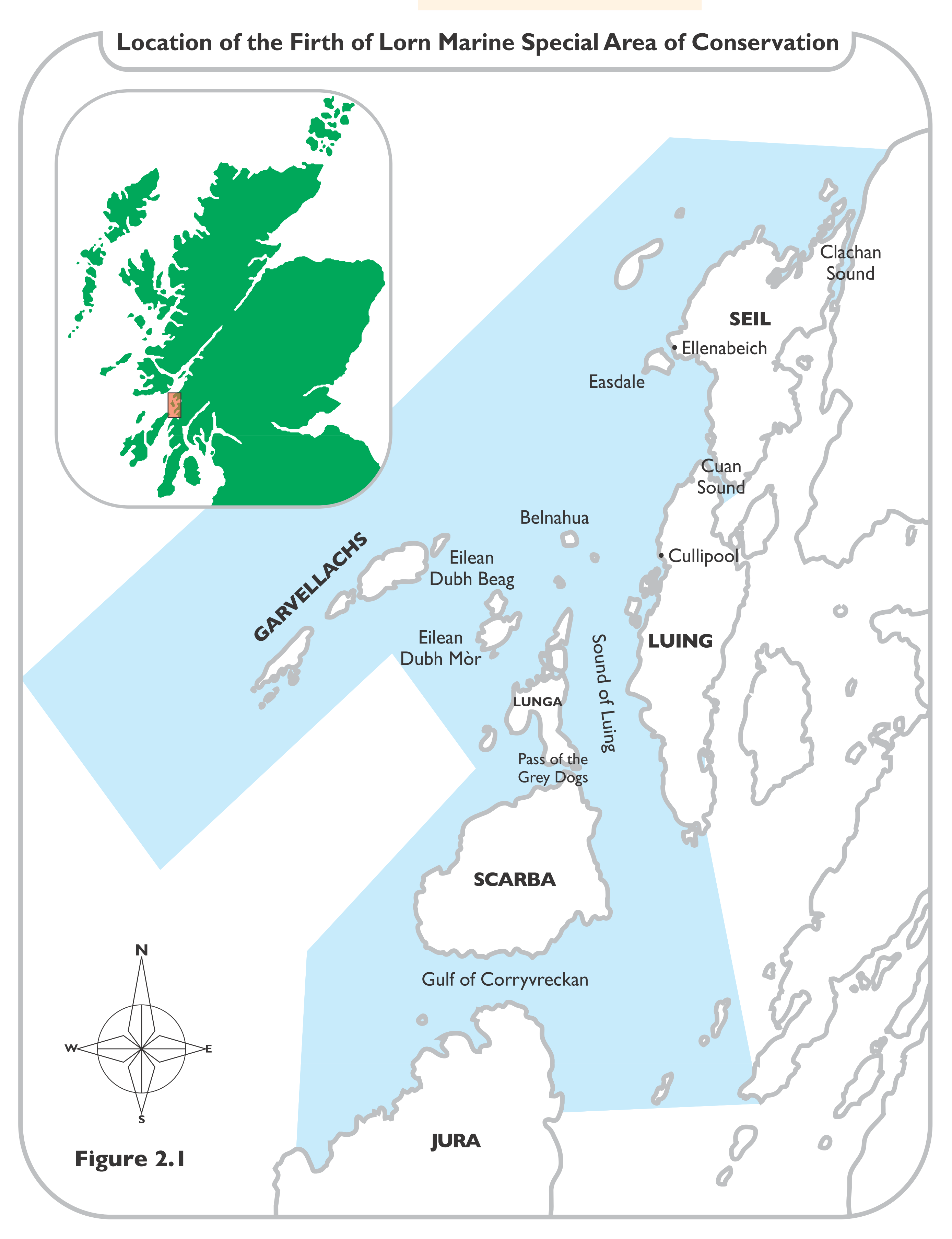 스카르바와 룽가 사이의 Bealach a'Choin Ghlais|gla("회색 개"의 해협)는 코리브레칸 해협보다 더 좁아 훨씬 더 위험하다.[5] 이 해협 역시 론 피르스의 강한 조류 특성을 공유하며, 특히 밀물 때 위험성이 높아진다.5. 해양 생태계와 보존