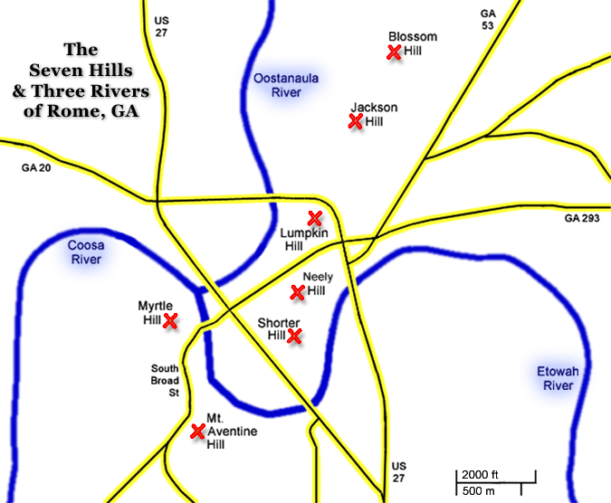 로마의 이름을 지어준 7개의 언덕은 블러섬, 잭슨, 럼킨, 아벤티노 언덕, 머틀, 올드 쇼터, 니리 언덕(후자는 타워 또는 시계탑 언덕으로도 알려져 있다)으로 알려져 있다. 로마가 설립된 이후 일부 언덕은 부분적으로 개조되었다.[36][37]