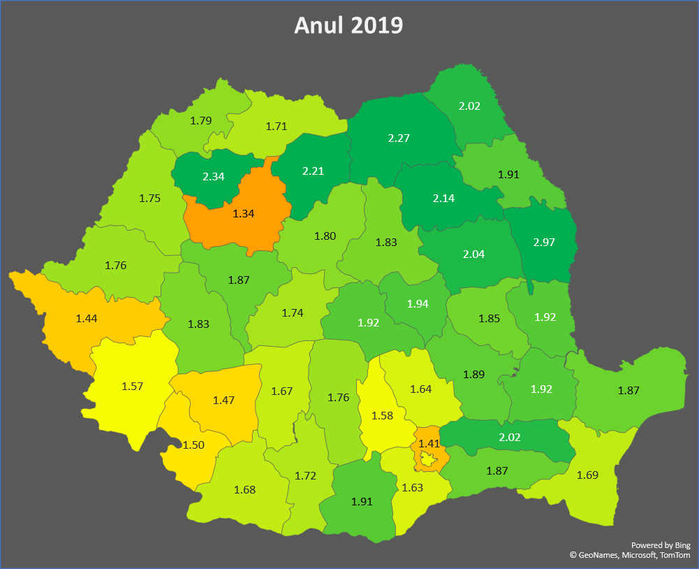 루마니아 주별 합계 출산율 (2019)
