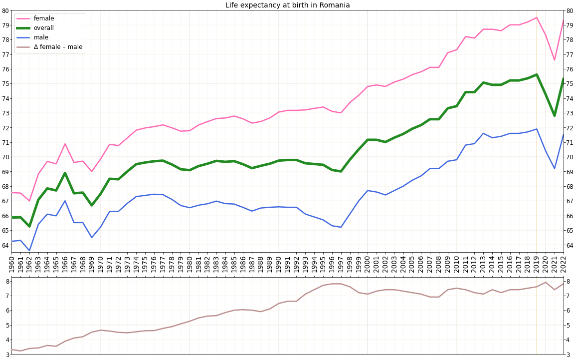 다른 동구권 국가들처럼 소련이 붕괴할 즈음, 루마니아는 출생률 급감과 사망률 급증을 겪으며 출생아 수가 사망자 수를 밑도는 자연 감소 현상, 이른바 러시안 크로스를 경험했다. 이러한 인구 감소 추세는 현재까지 이어지고 있다. 루마니아 인구는 1990년에 2,320만 명으로 정점을 찍었으나[53][9][10], 이후 꾸준히 감소하여 2020년에는 1,926만 명[53], 2021년에는 1,912만 명[9]으로 줄어들었다. 이러한 인구 감소는 높은 사망률, 1990년대 이후 지속된 낮은 출산율, 그리고 상당한 규모의 해외 이민이 복합적으로 작용한 결과이다.[9] 특히 2001년 이후 노동 목적의 이민이 급증했으며, 이들 중 일부는 이주한 국가에 영구 정착하는 경향을 보여 실제 인구 감소폭은 공식 통계보다 더 클 수 있다.[11] 다른 동구권 및 구소련 국가들과 마찬가지로 루마니아는 인구 유출로 인해 높은 인구 감소율을 보이고 있으며, 2015년부터 2020년까지 연평균 인구 성장률은 -0.7%를 기록했다.[53]