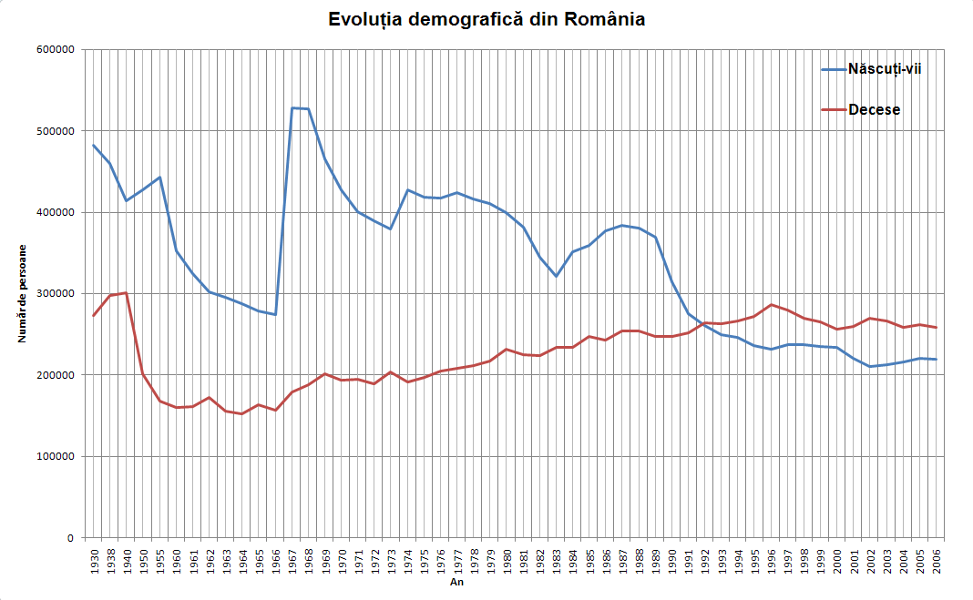 아래 표는 루마니아 국립 통계 연구소(INS) 자료를 바탕으로 1946년부터의 주요 인구 변동 추이를 보여준다.[37] 1966년 이후 니콜라에 차우셰스쿠 정권의 강력한 출산 장려 정책(낙태 및 피임 금지)으로 인해 1967년과 1968년에 출생률과 합계출산율이 급증했으나, 이후 점차 감소하여 1992년부터는 사망자 수가 출생아 수를 넘어서는 인구 자연 감소가 시작되었다. 합계출산율은 인구 유지를 위한 대체출산율 수준인 2.1명에 크게 미치지 못하고 있다.