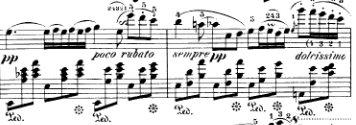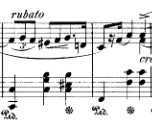 - 표현 강조: 멜로디 라인의 절정이나 아포지아투라와 같이 강렬한 표현의 순간을 만든다. 예를 들어, 녹턴 Op. 9 No. 2의 26마디에 "poco rubato"를 표시하여 연주자에게 강렬한 표현의 순간을 강조하도록 했다.[19]