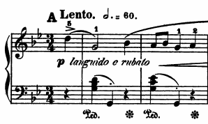 - 특정 분위기 설정: 곡의 시작 부분에서 특정 분위기를 설정하기 위해 루바토를 사용하기도 한다. 녹턴 Op. 15 No. 3의 첫 마디에 "Languido e rubato"를 표시하여 작품 전반에 걸쳐 나른한 분위기를 설정하도록 했다.[20]