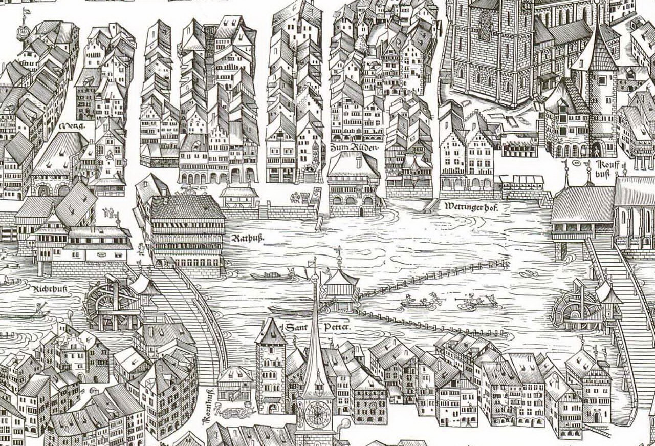 1576년 뮤러플랜에서는 건물이 리마트강 우안, 하우에 길드하우스 남쪽, 당시 '라이히스트라세'(제국 거리)에 위치한 것을 볼 수 있다.