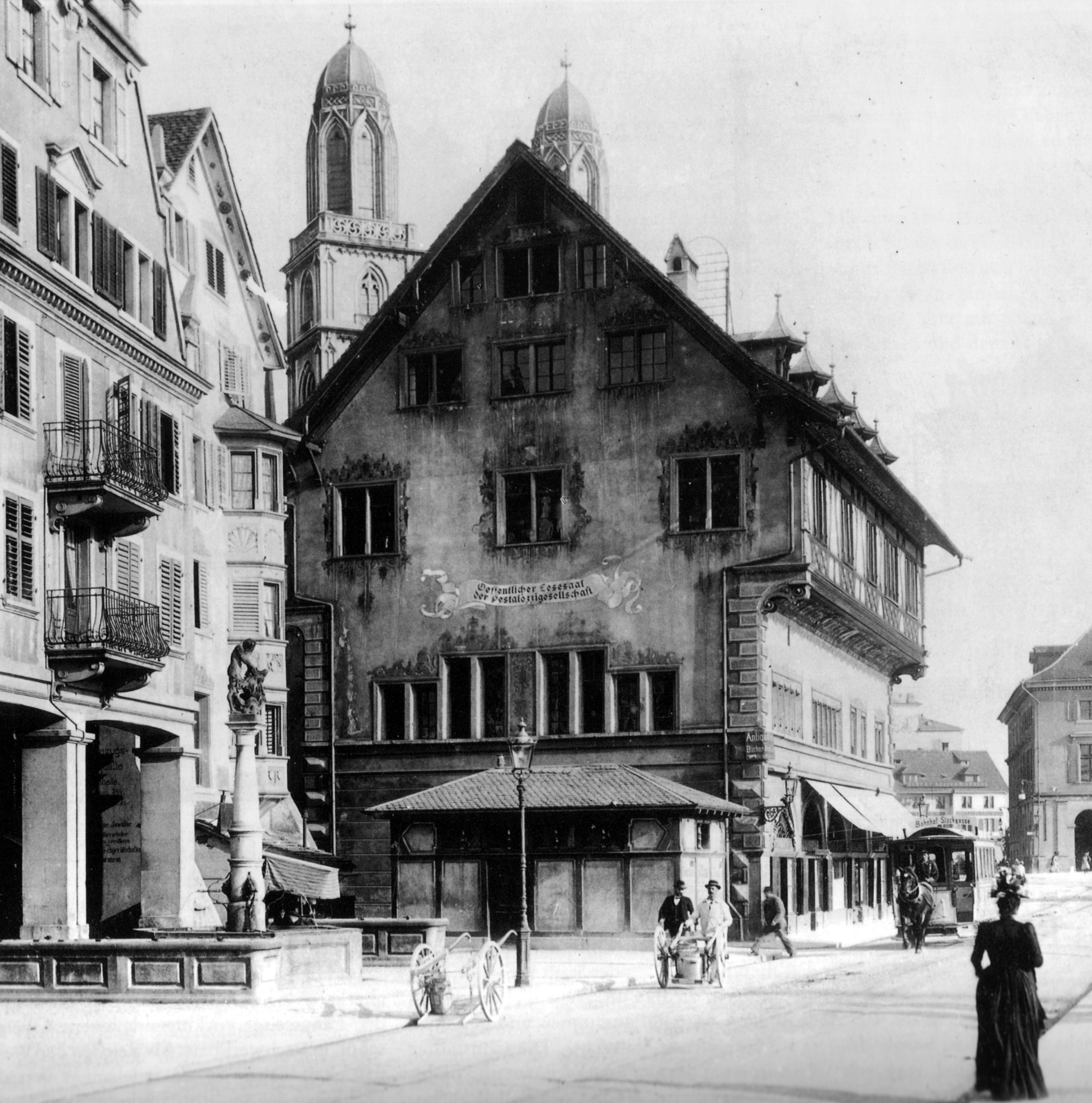원래 건물은 현재의 리마트콰이 산책로에 위치한 소박한 목조 건물이었으며, 당시 이 거리는 '라이히스트라세'(Reichsstrassede)라 불렸다. 도시의 전 지배자였던 프라우뮌스터 수도원의 원장은 이 건물을 조폐국으로 사용했다.[1] 시의회 명령에 따라 1348년, 1층은 석조 벽과 개방형 현관 홀로 재건되어 시청 용도로도 사용되었다. 2층에는 콘스타펠 협회 회원들이 사용하는 술자리 공간(음주 클럽)이 마련되었다.[1]