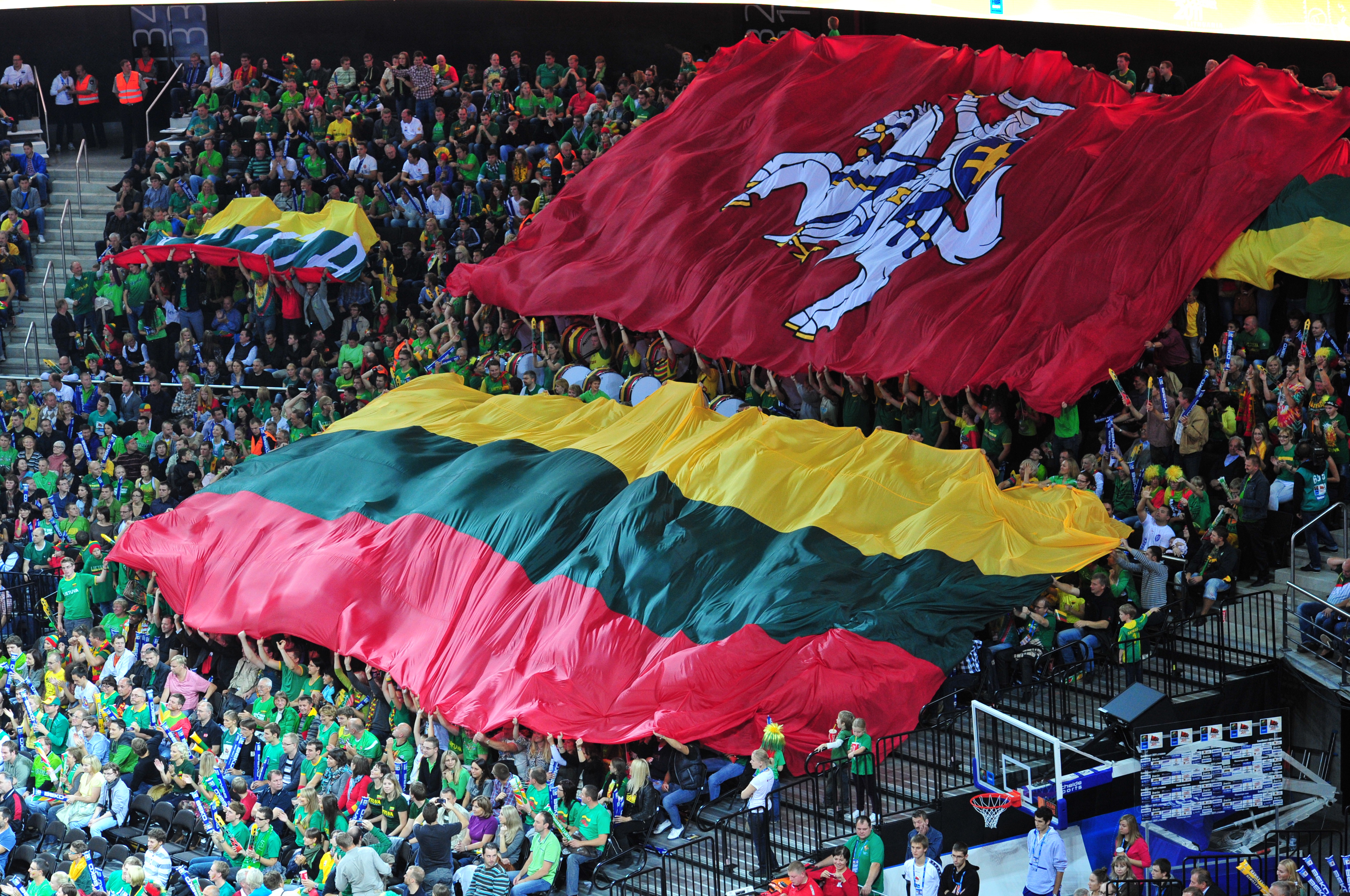15세기 얀 드우워고슈가 저술한 『프루텐인의 깃발(Banderia Prutenorum)』에는 리투아니아 정체성을 지닌 가장 오래된 깃발 기록이 남아 있다.[1] 1410년 그룬발트 전투에는 두 가지 다른 깃발이 등장했다. 40개 연대 대부분은 말을 탄 기사가 추격하는 모습이 그려진 붉은색 깃발을 사용했다. 이 깃발은 『비티스(Vytis)』로 알려져 있으며, 결국 리투아니아 전쟁기로 사용되었고 2004년에는 국기로 다시 채택되었다. 나머지 연대들은 게디미나스의 기둥(Columns of Gediminas)이 그려진 붉은색 깃발을 사용했다. 비티스를 사용한 연대는 리투아니아 대공국 군대(Grand Ducal Lithuanian army)에 속했고, 게디미나스의 기둥을 사용한 연대는 리투아니아 귀족(Lithuanian nobility) 출신이었다. 리투아니아 대공국은 18세기 말 폴란드 분할(Partitions of Poland)로 러시아 제국에 병합될 때까지 비티스를 깃발로 사용했다.[1]2. 2. 현대 국기의 탄생