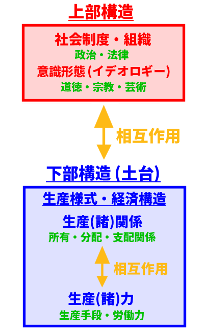 역사적 유물론은 마르크스주의의 기반 중 하나로, 생산방식의 기술적 진보가 생산의 사회적 관계 변화를 가져온다고 주장한다.[382][383][384][4][5][6][115] 사회의 경제적 "기반"은 문화, 종교, 정치, 사회 의식 등을 포괄하는 이념적 "상부 구조"를 지원하고 반영하며 영향을 미친다.[385][7][116] 마르크스는 법, 정치, 예술, 문학, 도덕, 종교를 사회의 경제적 기반을 반영하는 상부구조로 이해했다.[116]