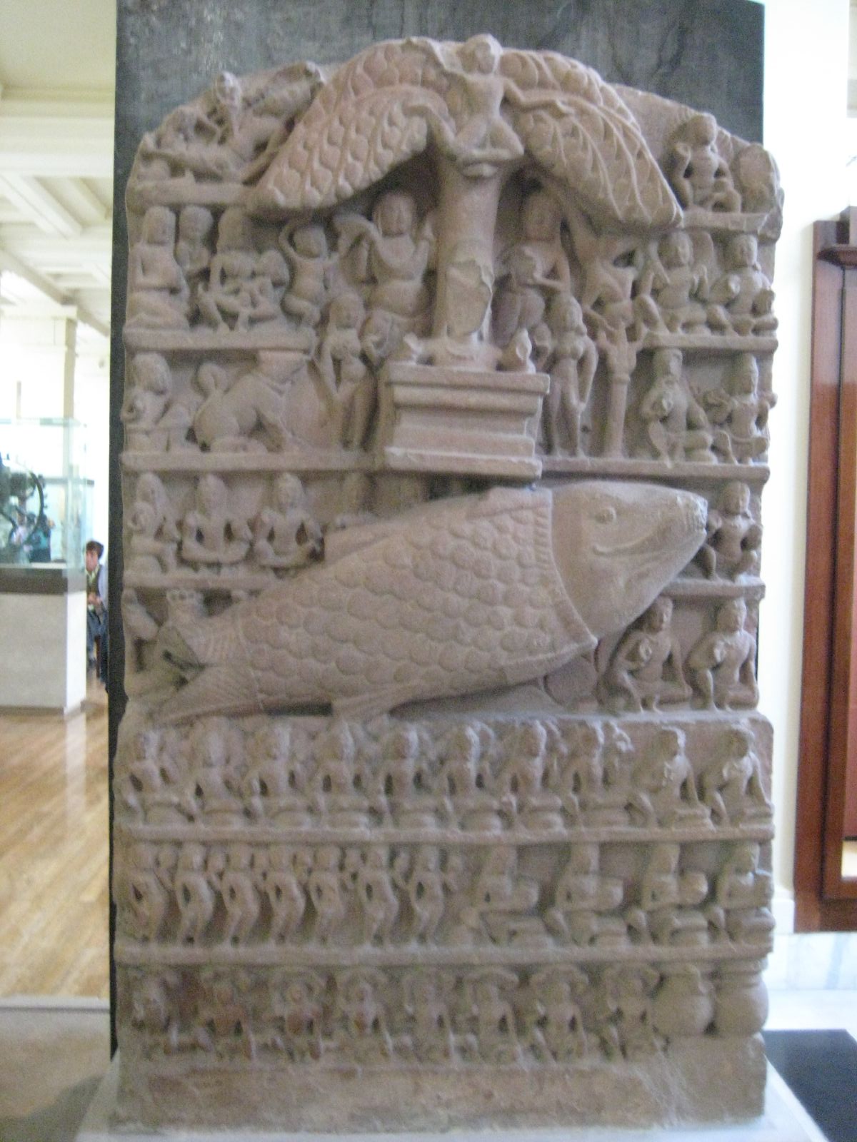 이 전설에 따르면, 입법자이자 조상 왕인 마누가 어느 날 몸을 씻으려고 가져온 물에 작은 물고기가 있었다. 물고기는 마누에게 자신을 보호해 주면 다가올 홍수에서 구해 주겠다고 약속한다. 마누는 약속을 받아들여 물고기를 키우다 바다로 보냈고, 물고기는 대홍수 시기를 알리며 배를 만들어 뿔에 묶으라고 한다. 예언된 날 마누는 배를 묶어 물고기와 함께 히말라야 산맥으로 피신한다. 살아남은 마누는 고행과 희생을 통해 생명을 다시 일으키고, 여신 이다와 함께 인간 종족을 시작한다.[13][14]