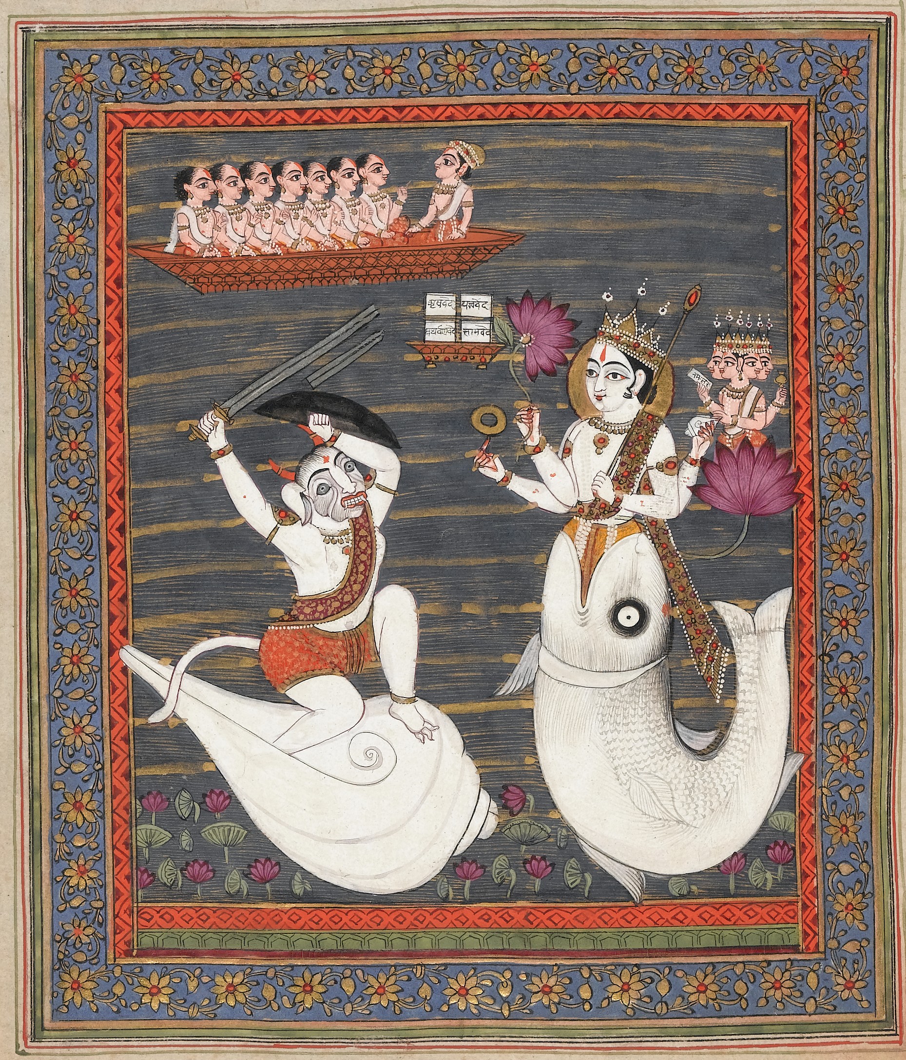 바라하 푸라나(Varaha Purana)에서는 브라흐마 대신 나리야나(비슈누)가 창조신이다. 나리야나는 우주 물에 잠긴 베다를 구하기 위해 물고기 모습으로 나타난다. 또 다른 이야기에서는 나리야나가 라사탈라(Rasatala)(저승)에서 베다를 가져와 브라흐마에게 준다.