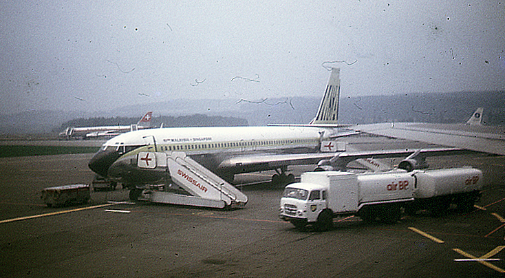 1972년 취리히-클로텐 공항에 착륙한 MSA 보잉 707. 1970년대 초반 장거리 국제 노선으로의 확장을 보여준다.