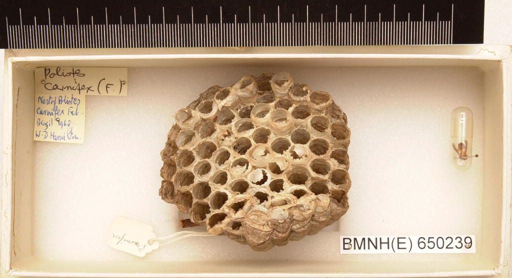 1768년, HMS 엔데버호는 플리머스를 출발하여 제임스 쿡의 제1차 항해를 시작했다. 몇 달 후 리우데자네이루 항구에 도착했을 때, 승객 중 한 명인 부유한 박물학자 조셉 뱅크스는 거대한 말벌 암컷 표본을 얻었다. 이 표본은 1771년 뱅크스가 영국으로 돌아올 때까지 전 세계를 함께 여행했다.[11][12][13]