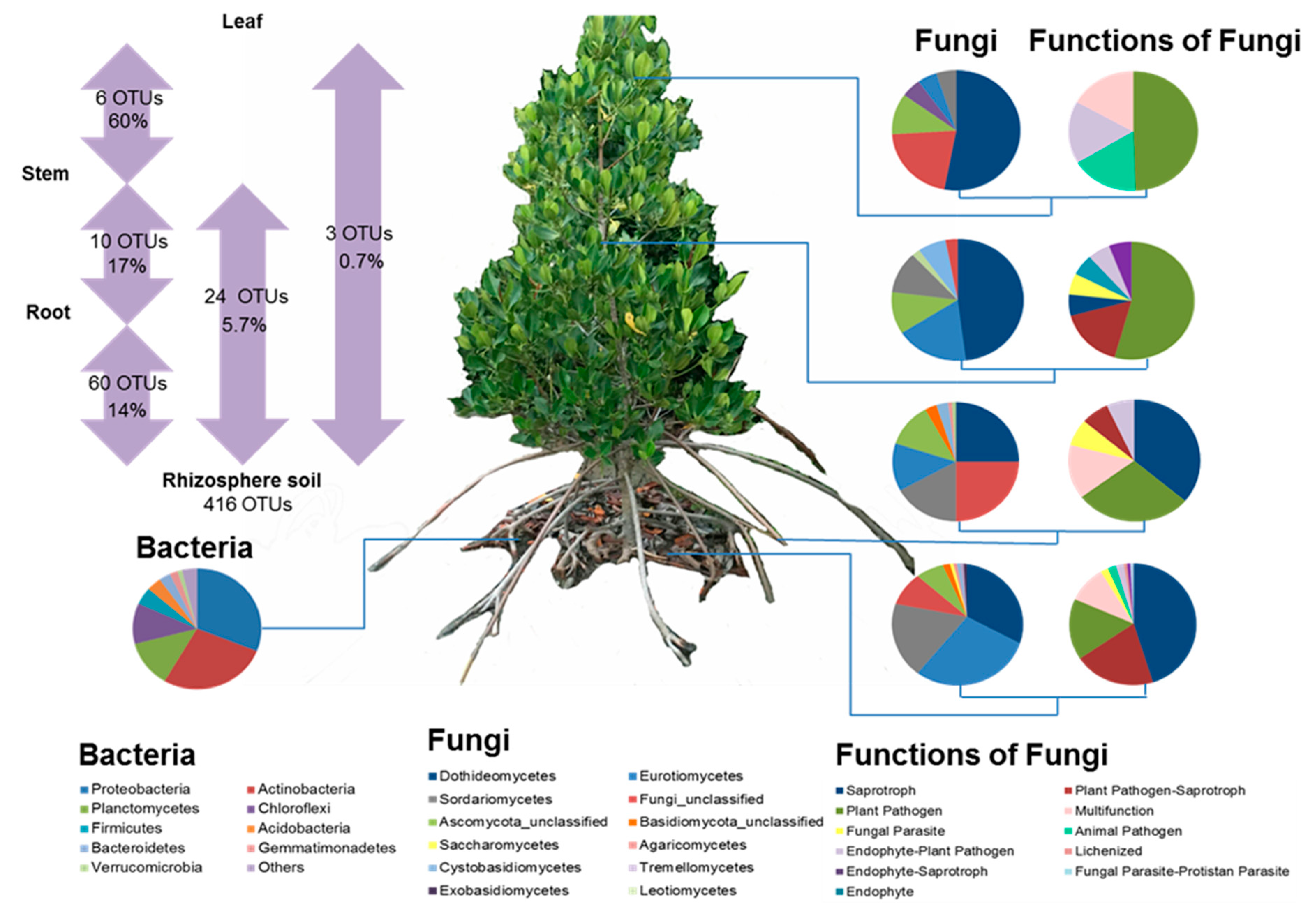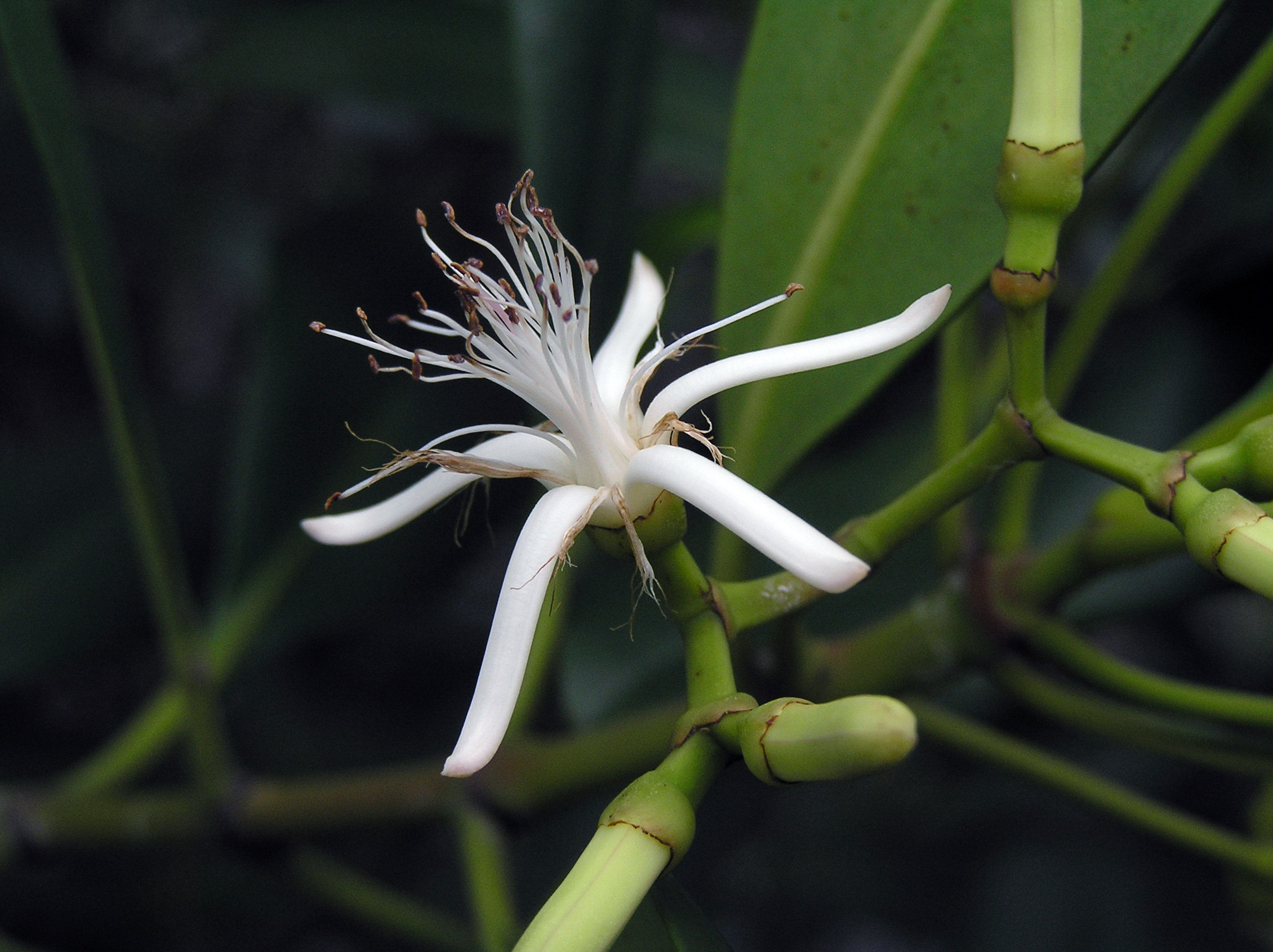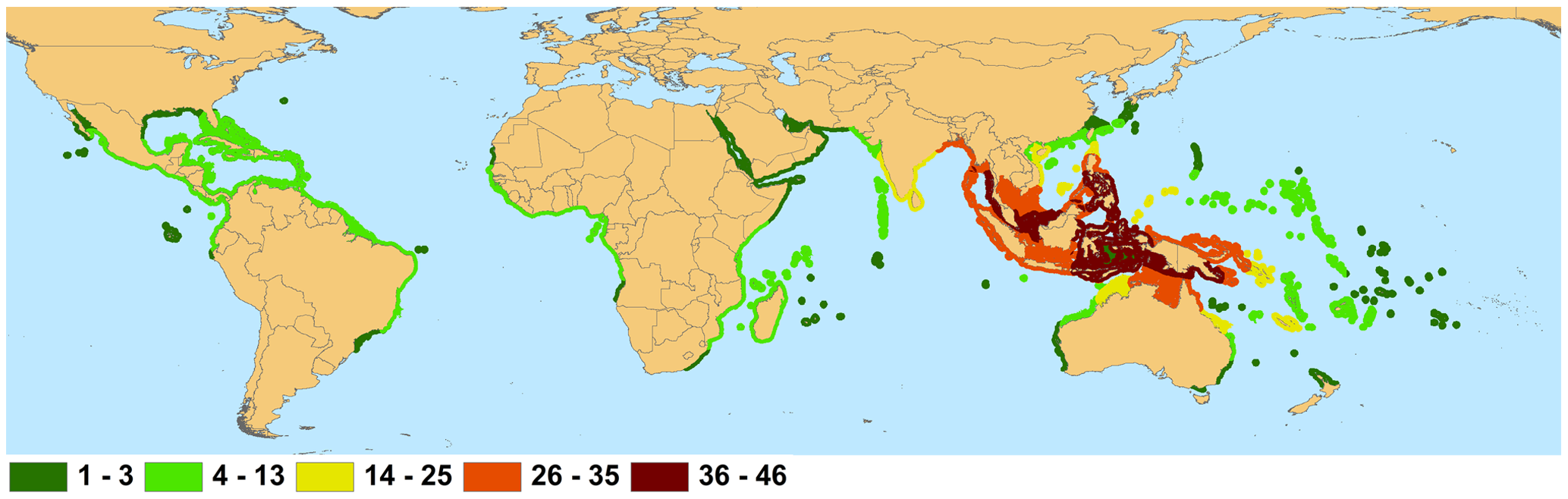 약 110종이 염수 습지에서 자라는 나무라는 의미에서 맹그로브로 간주되지만,[41] 극히 일부만이 맹그로브 식물 속인 ''Rhizophora''에 속한다. 그러나 특정 맹그로브 습지는 일반적으로 소수의 나무 종만을 특징으로 한다. 카리브해의 맹그로브 숲에는 3종 또는 4종의 나무만 있는 경우가 드물지 않다. 비교하자면 열대 우림 생물군계에는 수천 종의 나무가 있지만, 이것은 맹그로브 숲에 다양성이 없다는 것을 의미하지 않는다. 나무 자체는 종이 적지만, 이 나무들이 만드는 생태계는 최대 174종의 해양 대형 동물을 포함한 다양한 다른 종들의 서식지를 제공한다.[42]