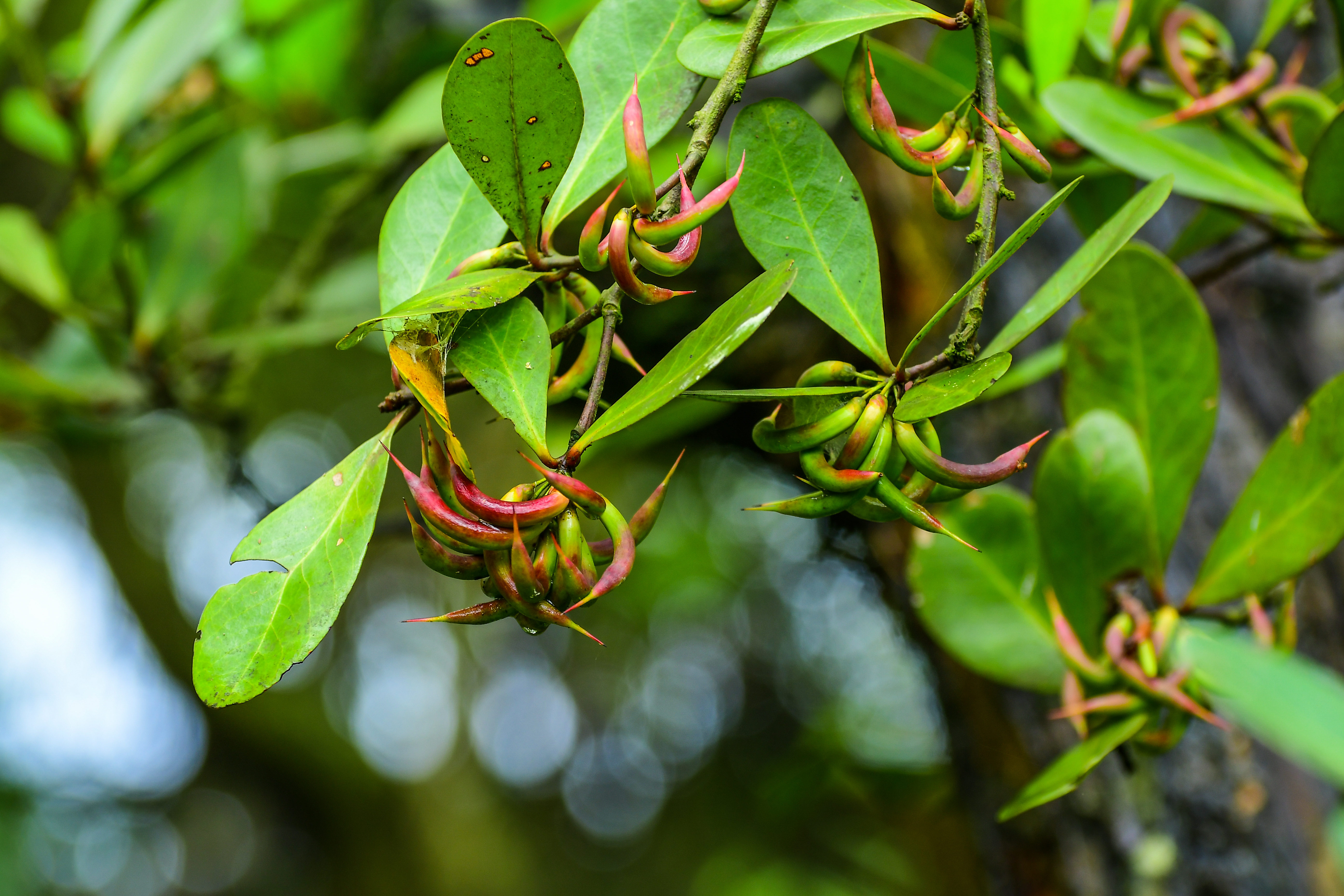 붉은수염과 식물들은 모두 윤기 있는 타원형의 잎을 가지며, 잎은 두껍고 큐티클층으로 덮여 있다. 또한, 호흡근을 가지고 있으며, 그 형태는 종류에 따라 다양하다.