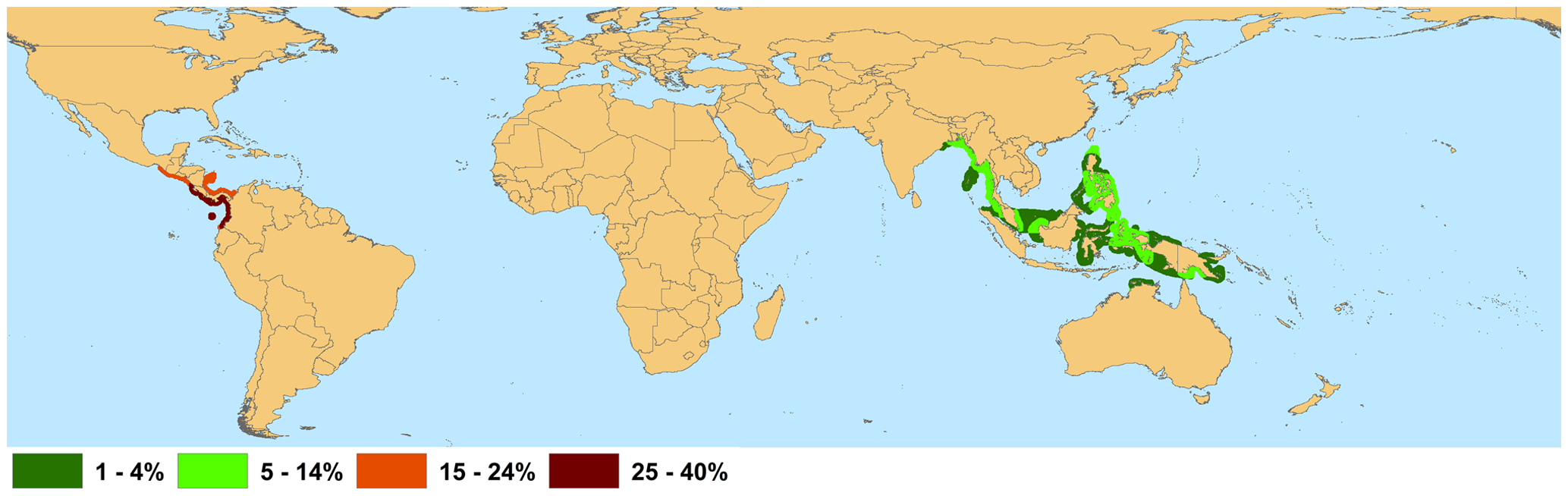 니파야자는 습지 진흙에 뿌리를 뻗는 9m 높이의 상록 소교목으로, 남아시아, 동남아시아, 오세아니아에 분포하며 건축, 식량 등 다양한 용도로 쓰였으나 현재는 멸종 위기종이다. - 생물 군계 - 생물지리학