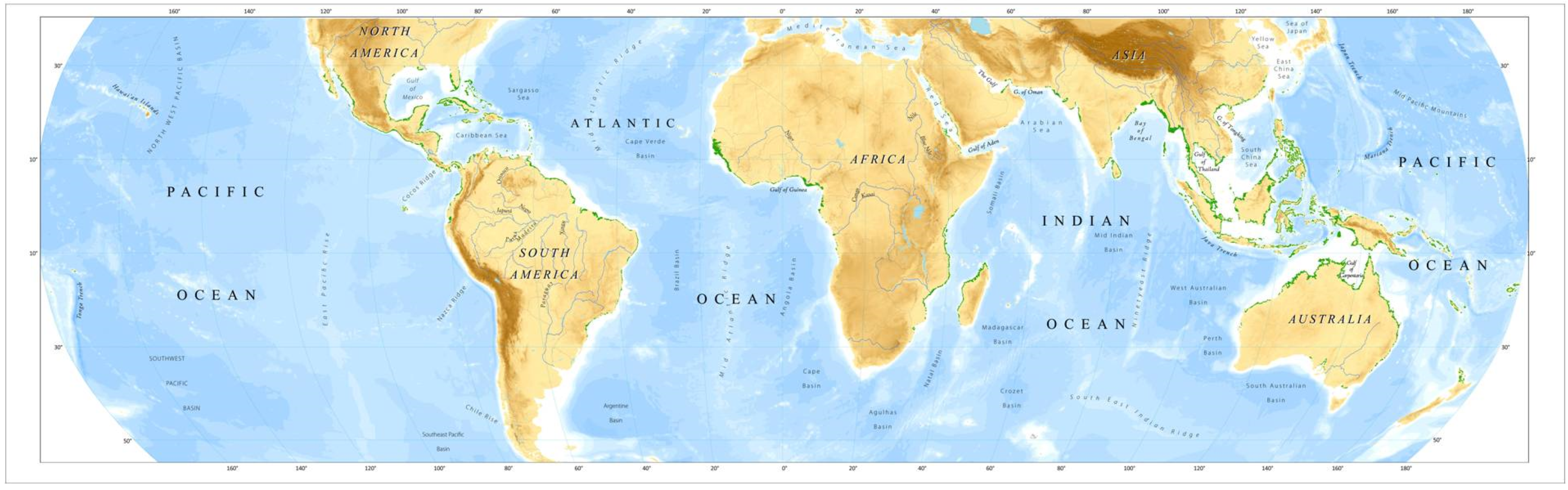 맹그로브 숲은 열대에서 아열대 지역의 하구와 기수역의 염성 습지에 형성되는 삼림이다. 세계적으로 동남아시아, 남태평양, 호주, 인도 근해, 아프리카, 아메리카에 분포하는데, 일본에도 오키나와현과 가고시마현에 자연 분포하고 혼슈 일부 지역에도 인공적으로 옮겨 심은 맹그로브 숲이 존재한다.[6]