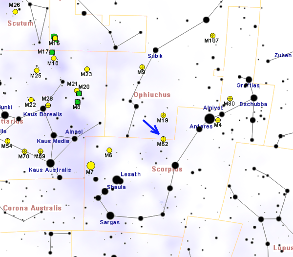 메시에 62는 구상 성단으로, 편평률이 높고 균형이 잡히지 않은 형태를 띤다. 은하수 중심부에서 비교적 가까운 거리에 위치하여 조석력의 영향을 받으며, 중심핵 붕괴 가능성이 제기된다. 찬드라 X선 관측 위성 관측 결과 다수의 X선 쌍성이 발견되었으며, 이는 항성 간의 상호 작용으로 생성된 것으로 추정된다. 1771년 샤를 메시에에 의해 발견되었으며, 윌리엄 허셜에 의해 별들의 모임으로 처음 분해되어 관측되었다.