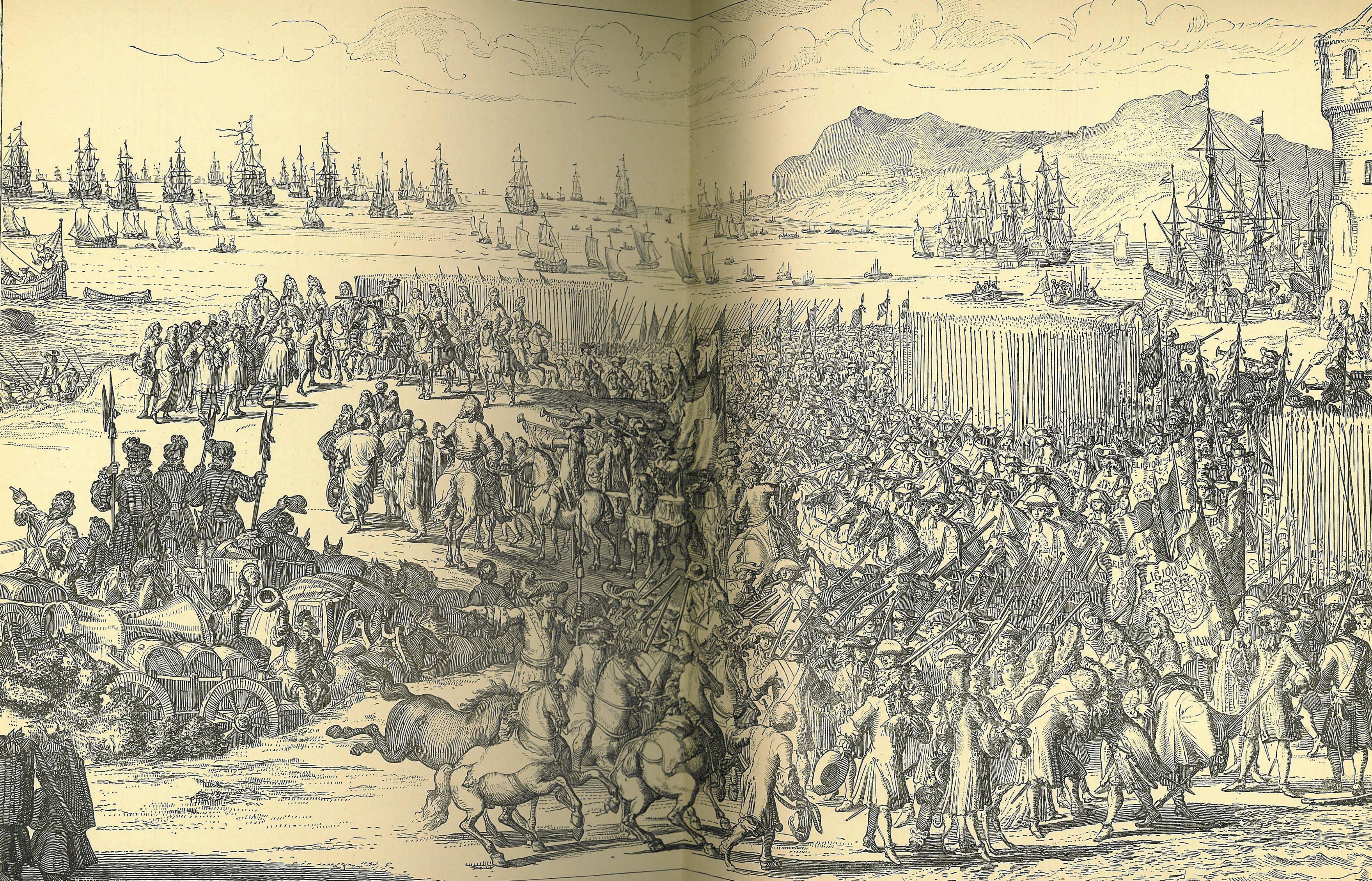 윌리엄은 암스테르담의 지원을 받기 위해 어려운 협상을 벌였다.[10] 벤팅크는 400척의 수송선과 13,616명의 독일 용병을 모집했고, 네덜란드 용병도 준비되었다.[10] 윌리엄은 유대인 은행가 프란시스코 로페스 수아소로부터 자금을 빌렸으며, 교황 인노첸시오 11세도 프랑스의 루이 14세를 견제하기 위해 자금을 빌려주었다.[10]