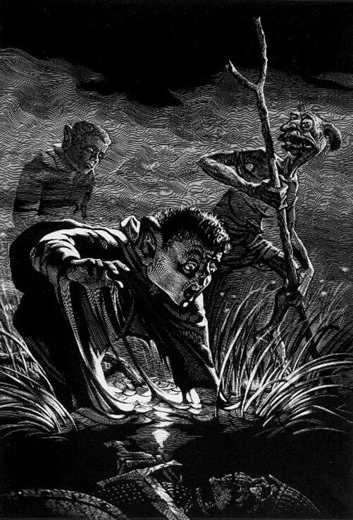 wudu wyrtum fæst / wæter oferhelmað. þær mæg nihta gehwæm / niðwundor seon, fyr on flode. ... Nis þæt heoru stow! | 뿌리가 깊은 나무들 / 물을 가린다 거기서 매일 밤 / 끔찍한 기적을 볼 수 있다 물 위의 불... 이곳은 안전한 곳이 아니다. | "넓은 늪과 진창... 안개가 맴돌고 연기가 났다 어둡고 불쾌한 연못에서". "시체를 위한 촛불" (죽음의 늪의 불빛) |